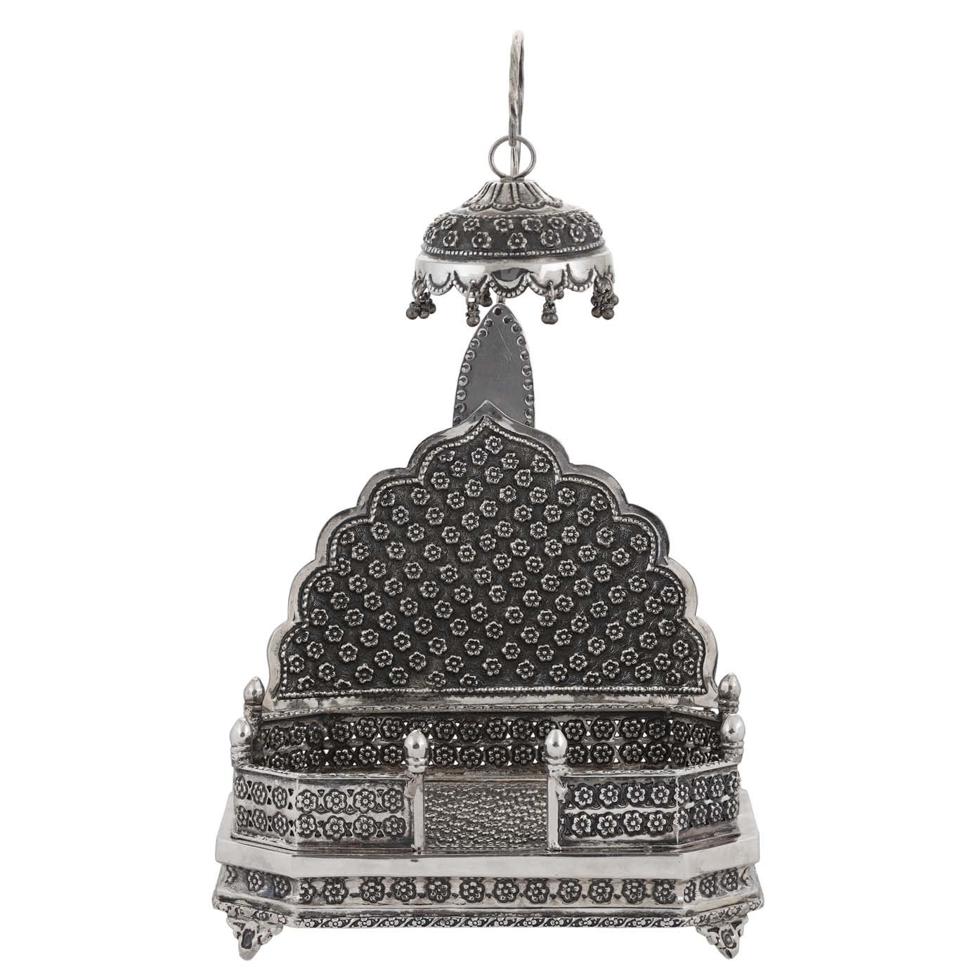 A traditional Antique Mandhasana with minute detailing on it to seat the Gods and Goddess. Just the design and carvings on it with floral engravings and the black polish makes it to project the carvings more deserving along with its umbrella on the top.