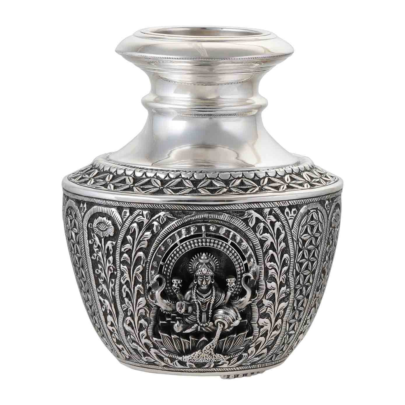 An Antique Silver Kudam designed with the divine Lakshmi Devi inscribed along with floral and leafy vines throughout the Kudam and make it more divine in it’s own way.