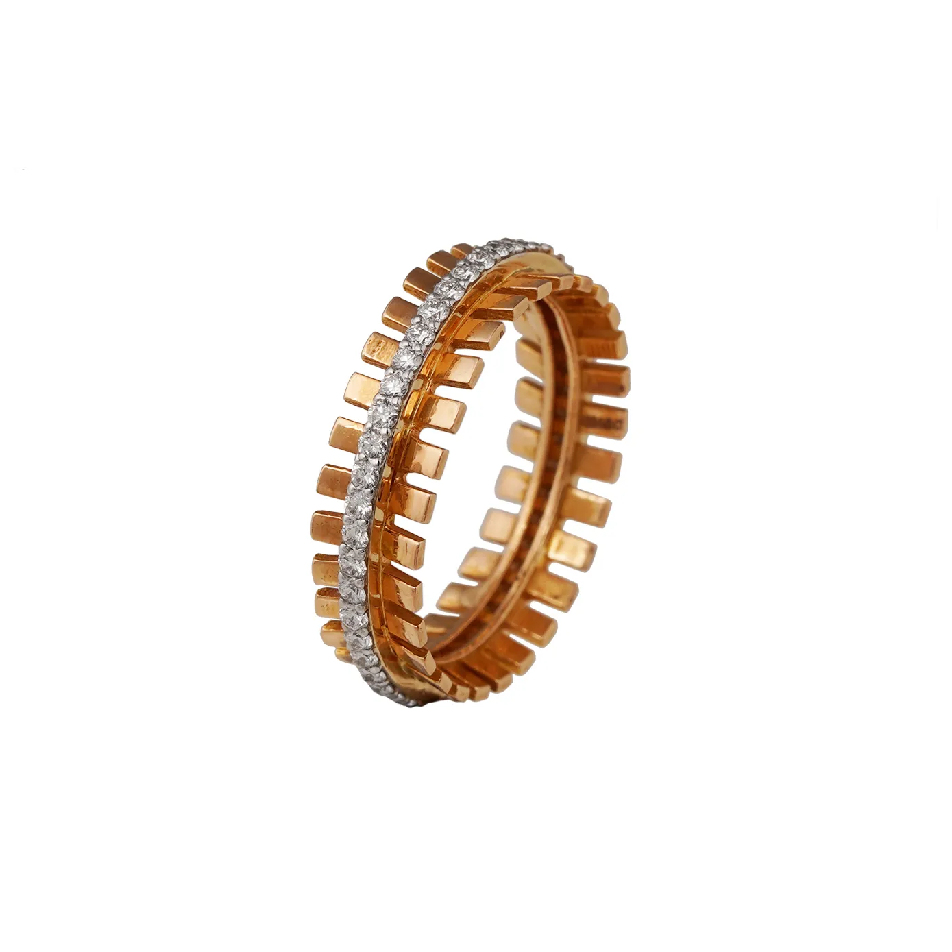 Embrace modern elegance with our stylish gold ring, adorned with diamonds that encircle the middle in a meticulously crafted design. The intricate arrangement of individual gold bars showcases perfect symmetry, creating a unique and modest look. This ring is versatile and suitable for any special occasion, adding a touch of sophistication and charm to your ensemble.
