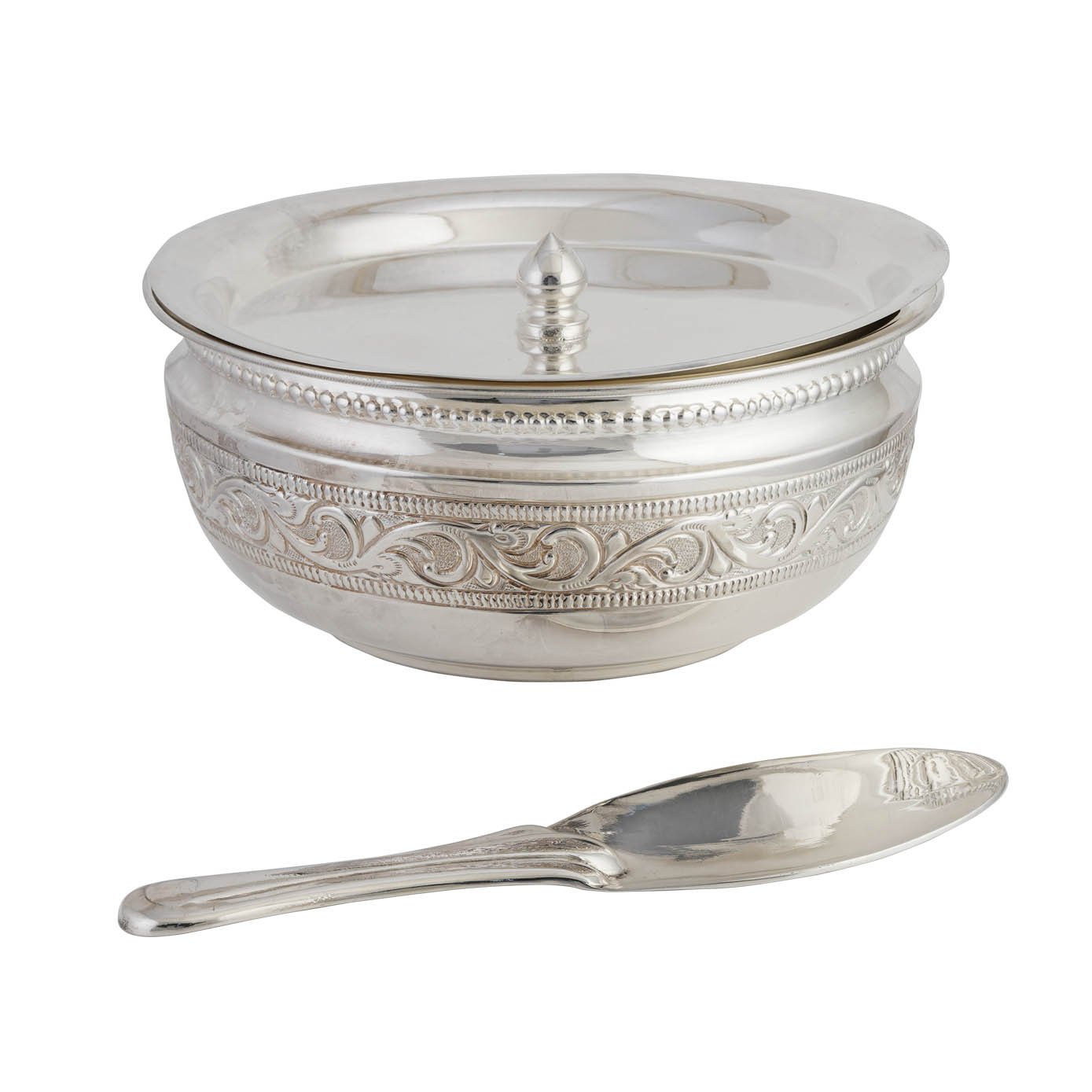Make your Anniversary, Wedding and All Precious days make Special with this big gift , Gift is small but it will fill your life with joy. 92.5% fine silver handmade bowl kitchen set with lid, will be an excellent gifting home dining décor silver vessels, Indian opinion is silver has proven antibacterial properties. Can be paired up with heavy Annakarandi.