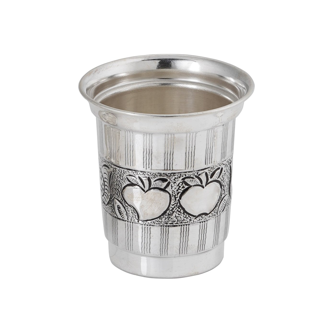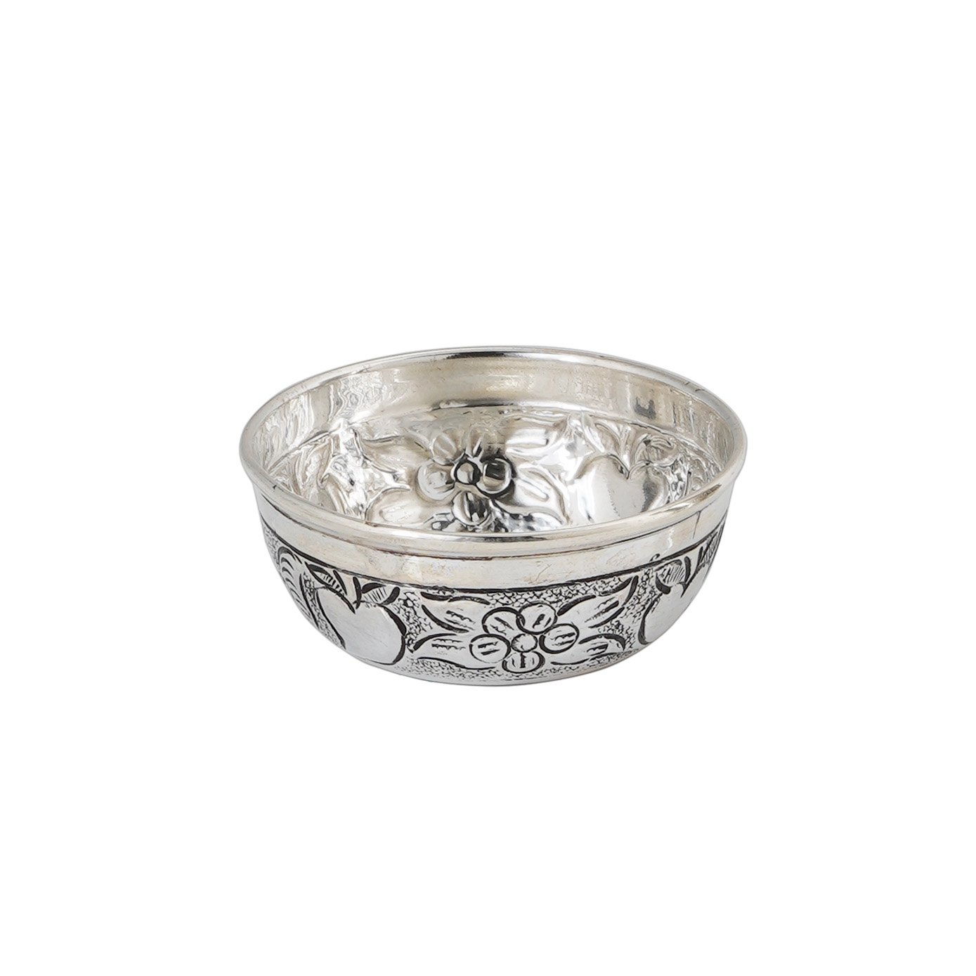 ANS Dhivyam's "Dhivya Velli" collection: an exquisite assortment of antique 925 silver tableware. Each piece is intricately engraved with charming motifs like apples, mangoes, and floral designs. This collection includes a plate engraved with tom and jerry picture, tumbler, cup, and spoon, all meticulously crafted to add elegance and artistry to your dining experience.