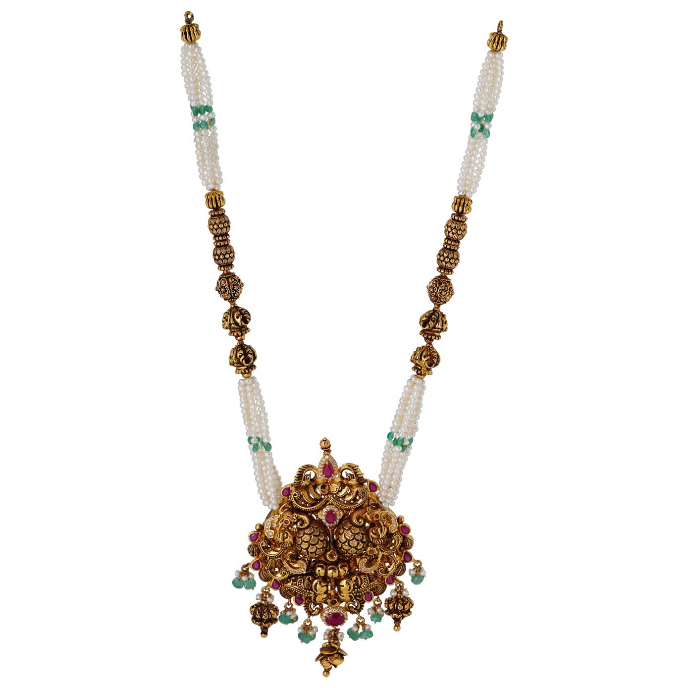 A stunning pearl beaded haram with shiny pearl beads and elegant turquoise beads to pair up elegantly with filigreed gold beads and a heavy antique pendant with peacock carvings on it and rubies studded along with zircons to make your special occasions more special. The craftsmanship involved in creating a pearl beaded haram is meticulous, with careful attention given to the quality and arrangement of the pearls.