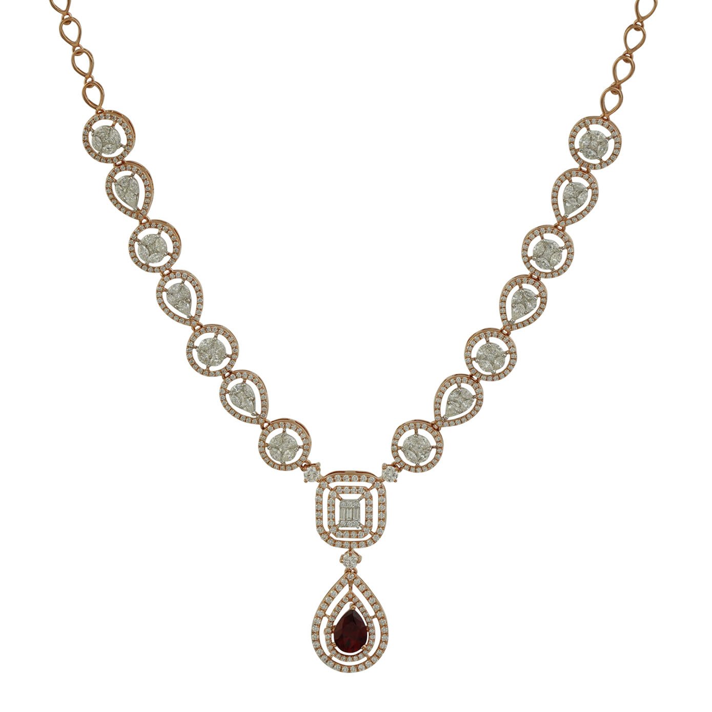 Featuring a unique design with a beautiful geometrical shape, this diamond necklace allows you to effortlessly personalize your style. The Diamonds are carefully selected for their vibrancy and allure, can be a perfect match for any occasion or mood. A single necklace with multiple cut diamonds like, round, marquise, emerald cuts and a special Pear cut Ruby studded in the middle.