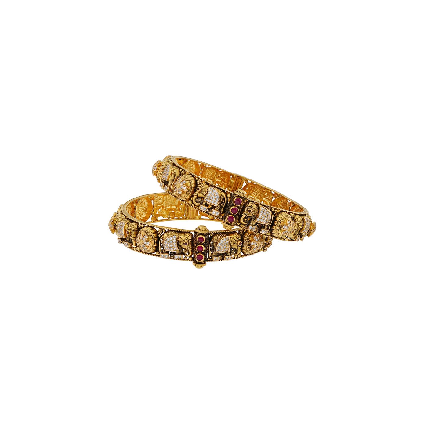 "Immerse yourself in the allure of antiquity with our stunning antique black finish bangle. Adorned with majestic elephant motifs, each intricately carved to perfection, this kada bangle captures the essence of traditional charm. Sparkling zircons and rich, semi-precious red stones embellish the surface, creating a harmonious fusion of opulence and heritage. A celebration of craftsmanship and timeless design, this bangle is more than an accessory; it's a symbol of regal elegance and cultural richness."