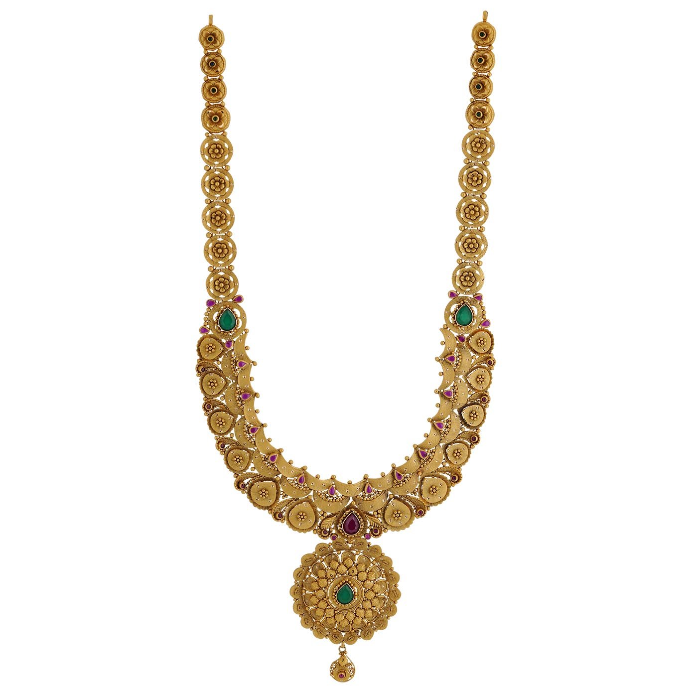 "Step into the allure of the past with our antique haram, a resplendent piece that transcends time. Imbued with a special matte finish, this necklace exudes a subtle, vintage charm. The sides are adorned with intricate floral patterns, adding a touch of nature's grace to the design. The yolk boasts the divine symbolism of dheepam and thilagam shapes, while a majestic chakra pendant commands attention. Completing the ensemble, tear-drop-shaped hangings showcase meticulous carvings, ensuring every inch of this haram is a canvas of artistry. A harmonious blend of tradition and craftsmanship, this antique haram is a timeless embodiment of beauty and grace."