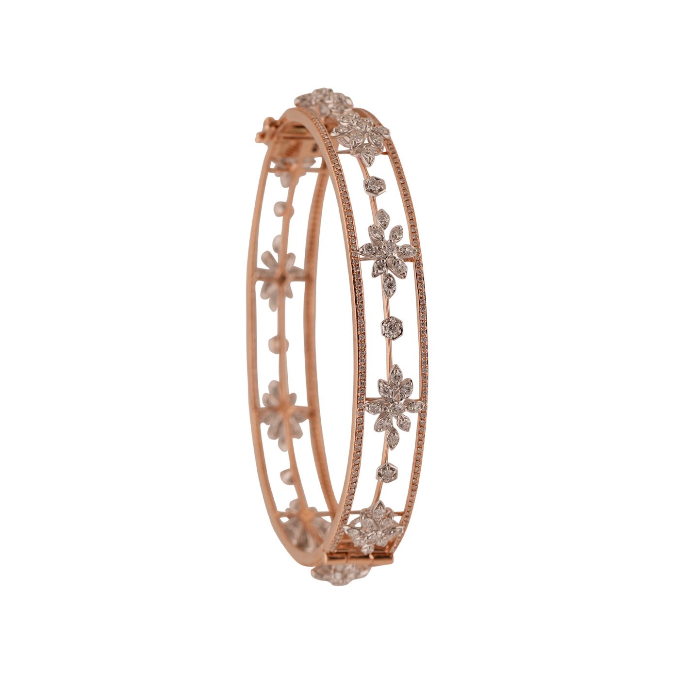 The intricately designed floral motif adds a touch of nature's elegance, symbolizing growth, beauty, and the perpetual renewal of life. This bangle is not just a piece of jewelry; it's a wearable work of art, a testament to the timeless union of craftsmanship and luxury. As you grace your wrist with this radiant bangle, let it be a reminder of the enduring beauty that lies within every detail. Elevate your style, captivate attention, and indulge in the allure of this 18kt rose gold diamond bangle—a celebration of sophistication and refinement.