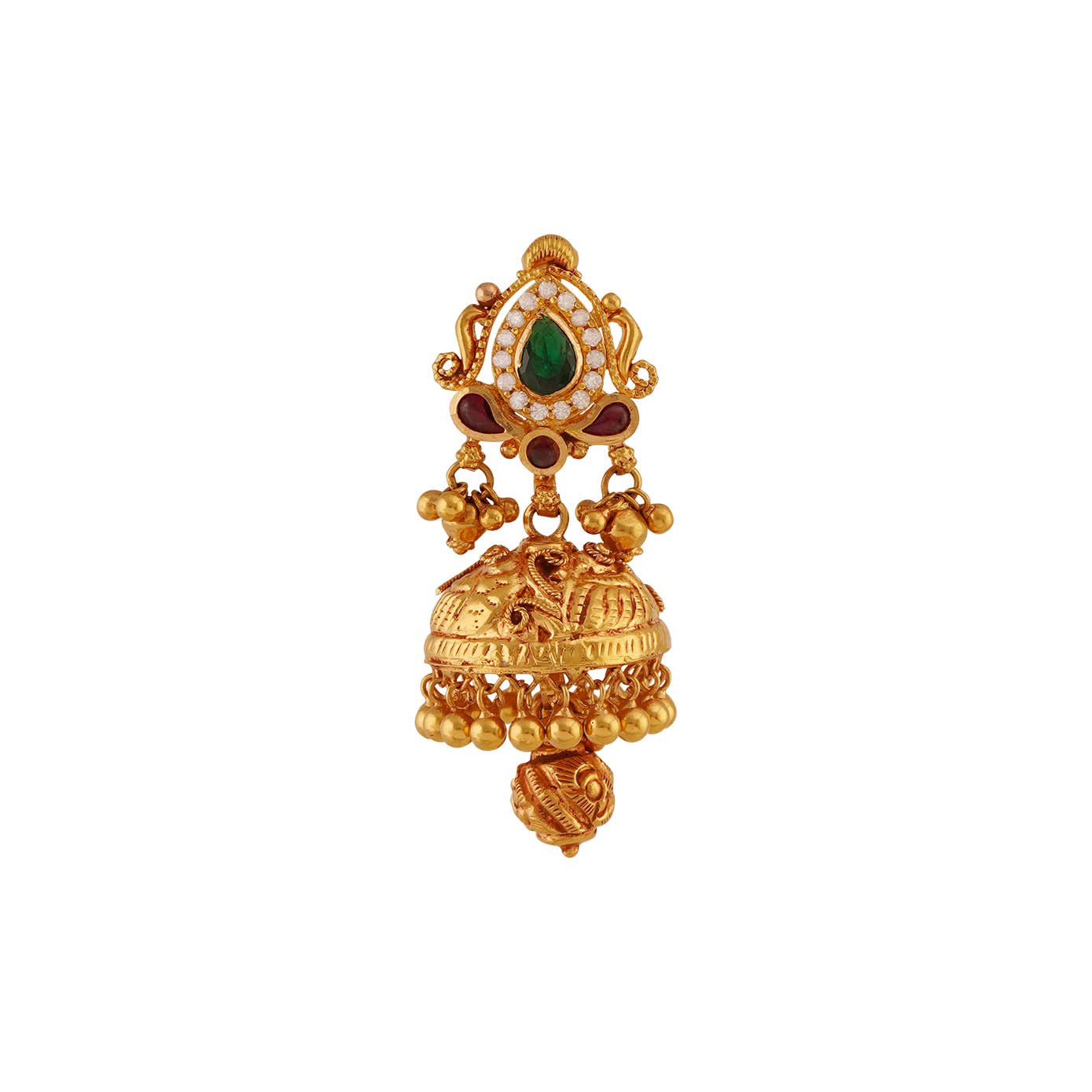 Draping your ears in a melody of antiquity, our Antique Jumkka emerges as a masterpiece of intricate carvings, adorned with a burst of colors through stones and enamels. Each detail tells a story of timeless craftsmanship, while multiple gold ball bead hangings add a playful sway to this vintage-inspired adornment. Wear these jumkkas to embrace a fusion of history and vibrancy, an ode to the artistry that transcends eras.