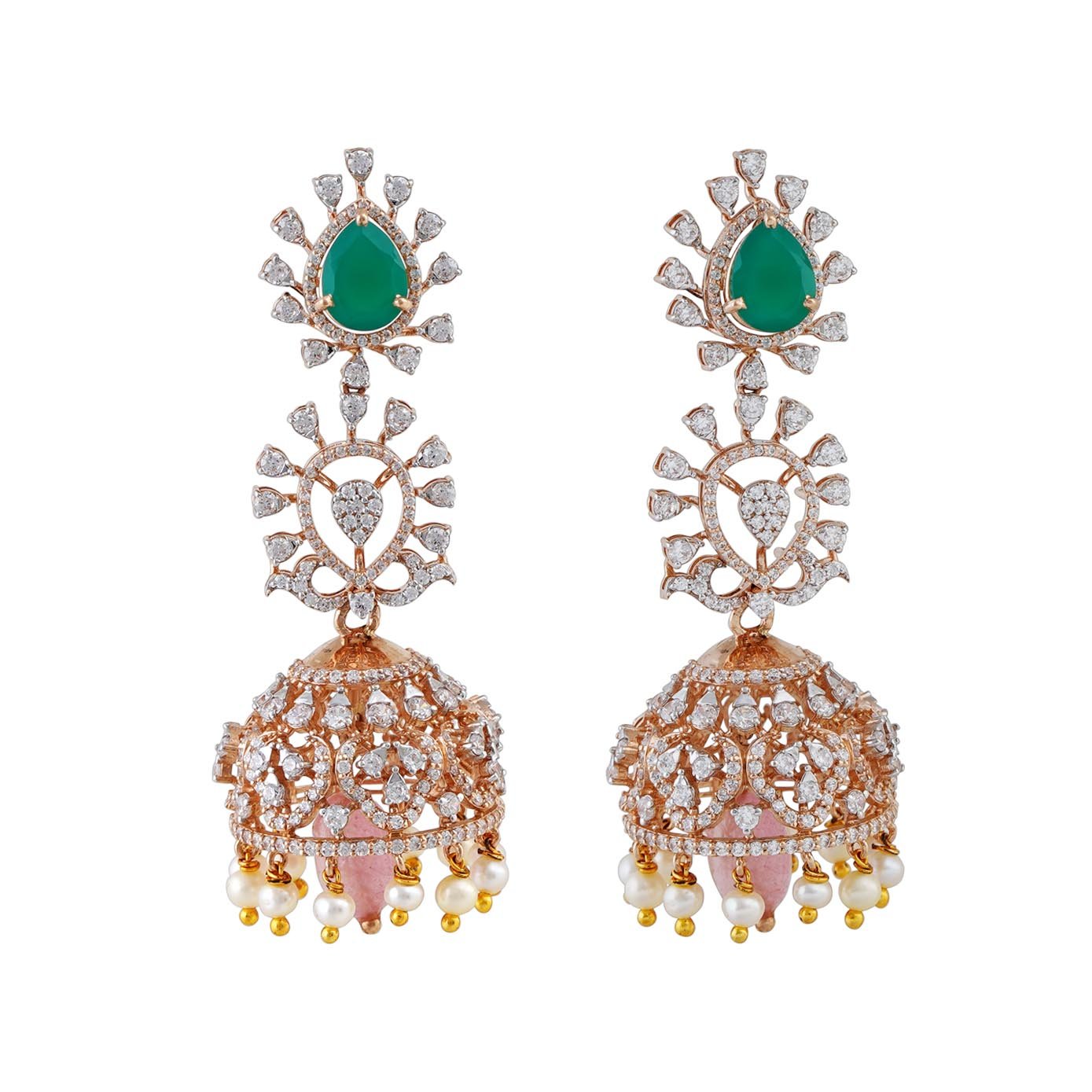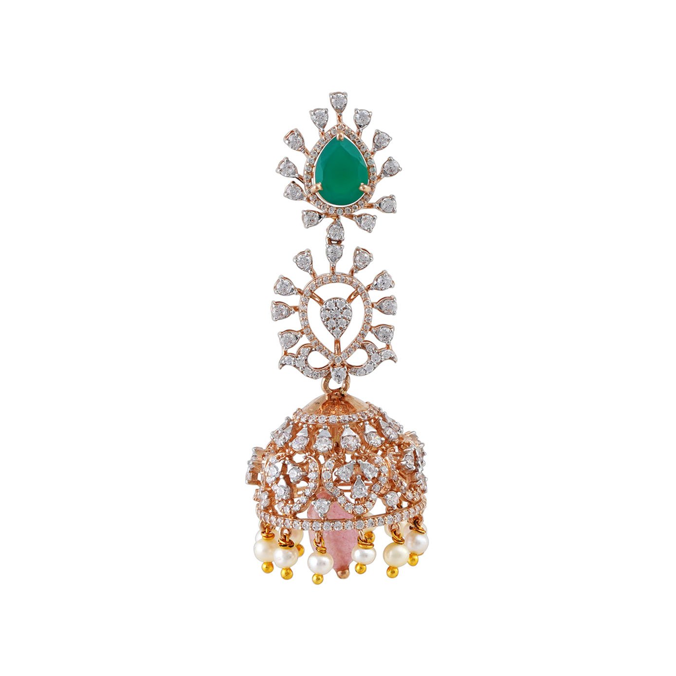 Grandeur Unleashed: Complete your ensemble with opulence! This 18kt rose gold haram, adorned with zircons, floral patterns, and semi-precious green stones, finds its perfect companionship in the magnificent jumkka. Three layers of pink semi-precious jade beads gracefully frame the sides, crowned with three hanging elements, ensuring a grand and beautiful symphony of elegance.