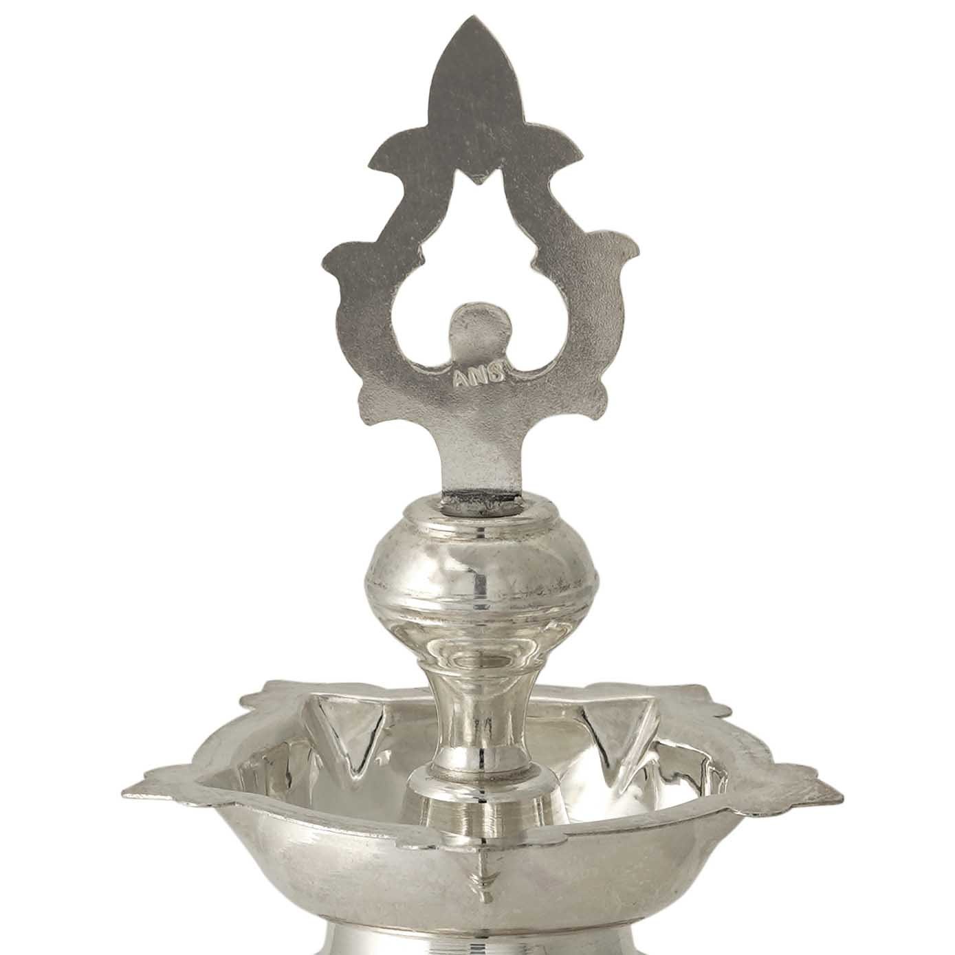 This mini pair of pure 925 Silver Kumbakonam Kuthu Vilakku exudes timeless elegance with a unique twist. Each lamp features a beautifully bulged pot-shaped stem, adding a touch of sophistication and individuality to its design. Crafted with precision and care, these lamps embody the rich cultural heritage of Kumbakonam. The purity of 925 silver enhances the lamps' allure, giving them a lustrous sheen that catches the eye. Whether adorning a sacred altar or gracing a decorative display, these exquisite Kuthu Vilakkus serve as a symbol of tradition and spirituality. Their unique design sets them apart as cherished treasures, perfect for adding a touch of grace and beauty to any space.