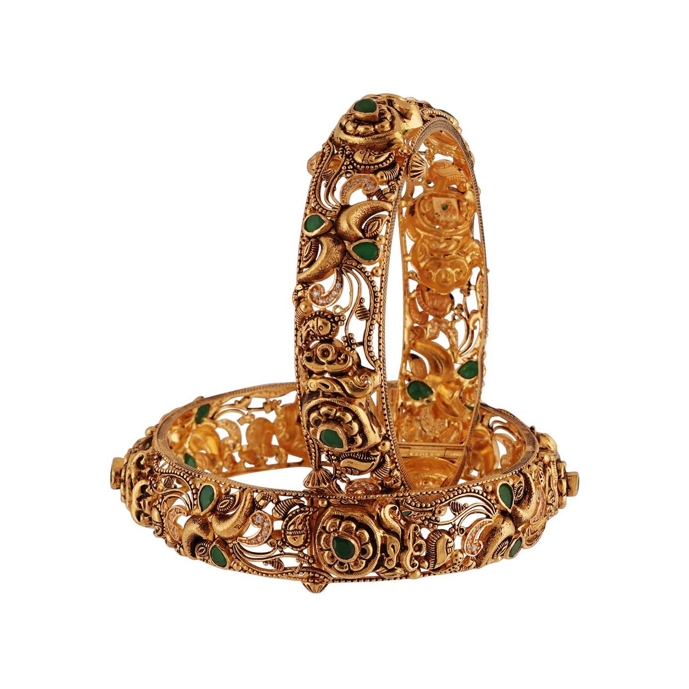 "Step into elegance with our enthralling bangles from ANS Dhivyam Jewels, designed in a kada style adorned with intricate floral patterns and multiple motifs. Each bangle is delicately studded with vibrant green stones, adding a touch of allure and sophistication. Perfect for enhancing your ensemble with a blend of traditional charm and contemporary style, these bangles are crafted to be a statement piece that exudes grace and elegance. Whether worn individually or stacked, they promise to elevate your look and become a treasured part of your jewelry collection."