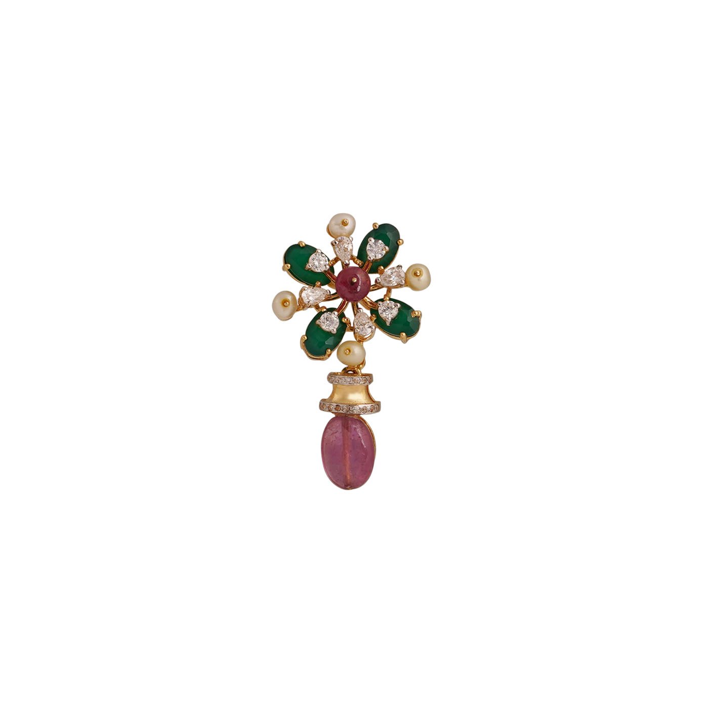 "Discover the enchanting allure of our 18kt rose gold necklace from ANS Dhviyam Jewels. This exquisite piece features a stunning arrangement of clustered semi-precious stones, vibrant beads, and lustrous pearls, all meticulously aligned to form a breathtaking floral pattern. Each element is thoughtfully chosen to enhance the necklace's beauty and charm, making it a perfect accessory to elevate any ensemble with a touch of elegance and sophistication. Indulge in the timeless grace of this masterpiece and let it be a cherished addition to your jewelry collection."