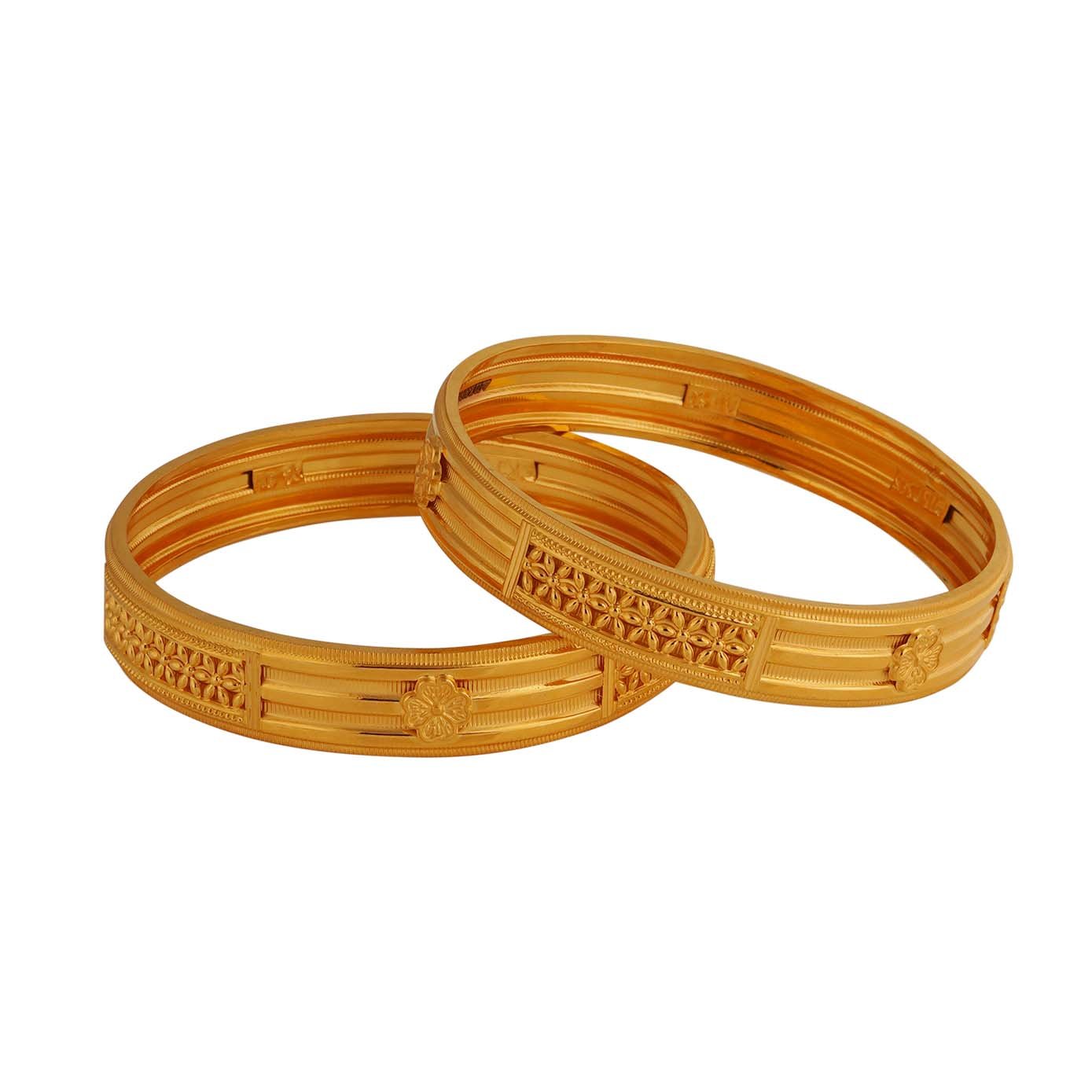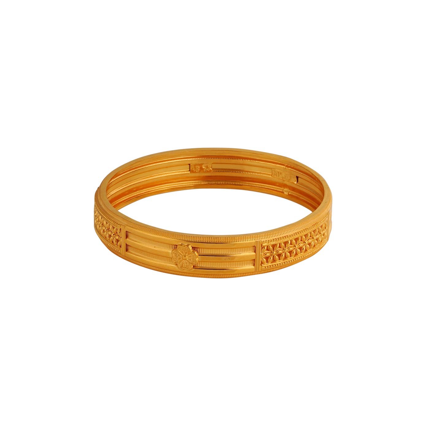 Experience timeless elegance with this stunning 22kt gold bangle, featuring a unique triple-layer design with hollow rims that create a light and airy feel. Each rim is adorned with delicate flower motifs crafted from thin gold strips, adding a touch of intricate artistry to the piece. This bangle seamlessly combines modern sophistication with traditional charm, making it a perfect accessory for any occasion, whether worn alone or stacked with other pieces for a more dramatic effect.