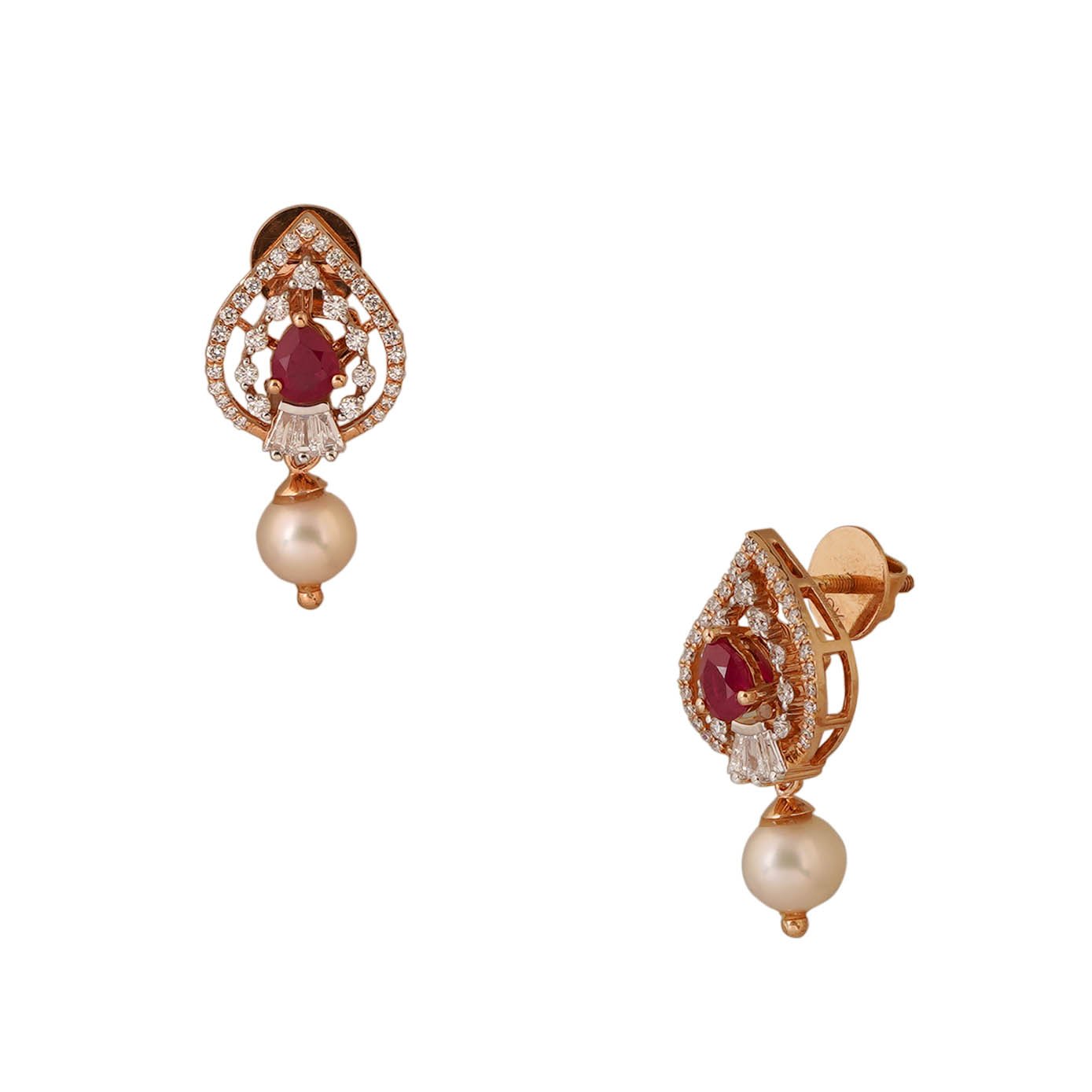 This elegant 18kt rose gold pendant and earring set is a versatile masterpiece, perfect for elevating any look. The pendant is designed in a graceful tear shape, featuring a stunning ruby at its center, encircled by three radiant layers of diamond lines that enhance its brilliance. A delicate pearl drop adds a touch of sophistication, completing the design with timeless charm. The set includes matching studs that mirror the pendant’s design for a cohesive and refined look. The highlight of this set is its unique surprise element: the center ruby can be easily swapped for an emerald or a blue sapphire, allowing you to customize the piece to complement your outfit and style. This makes the set a perfect combination of luxury, elegance, and versatility, ideal for both special occasions and everyday glamour.