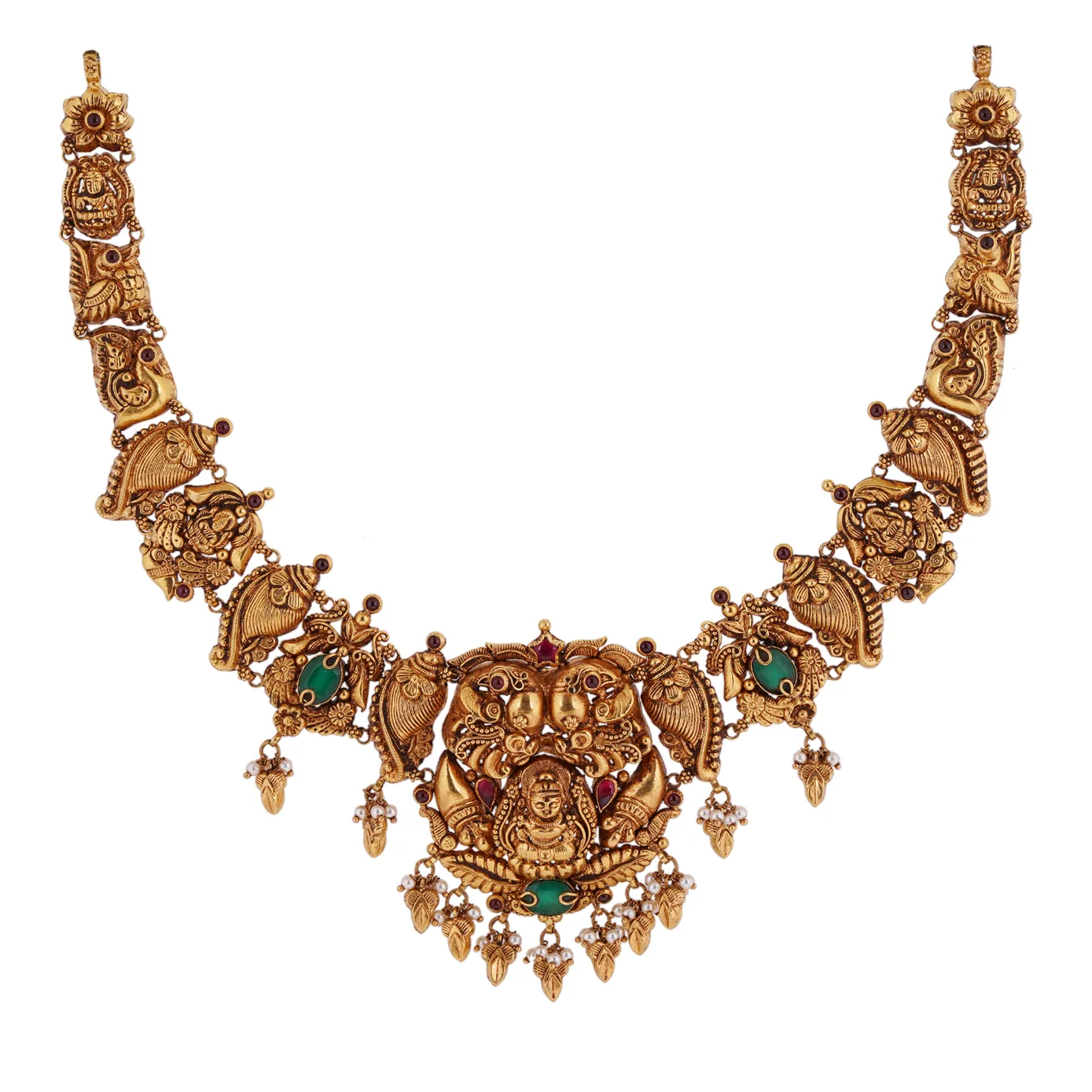 In this antique gold necklace, the graceful refinement and articulate beauty seamlessly merge with the embodiment of positivity through symbolic elements. Delicately interspersed small pearls evoke an aura of innocence and unwavering faith, casting a gentle and serene light. Meanwhile, the bold presence of kemp and vibrant green stones intertwines notions of courage and growth, forging a harmonious narrative of strength and flourishing. Allow this resplendent adornment to bestow its blessings upon your overall well-being, transforming it into a truly exquisite emblem of both aesthetic and spiritual enrichment.