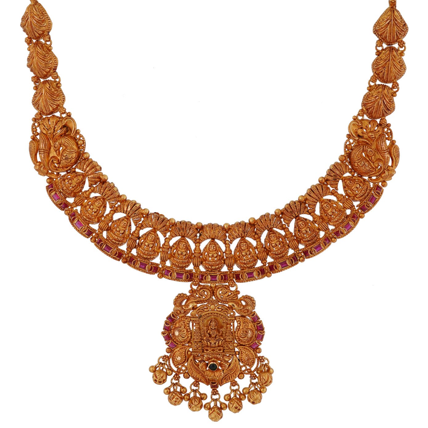 The opulence and magnificence of the piece are skillfully combined with extravagant gold elements, resulting in a strikingly vibrant visual impression. The intricate motifs that adorn the necklace have been meticulously crafted with a genuine sense of devotion, contributing to its exceptional prominence. Moreover, the delicate golden spheres suspended below serve to enhance the necklace's allure even further, adding an extra layer of captivating charm.