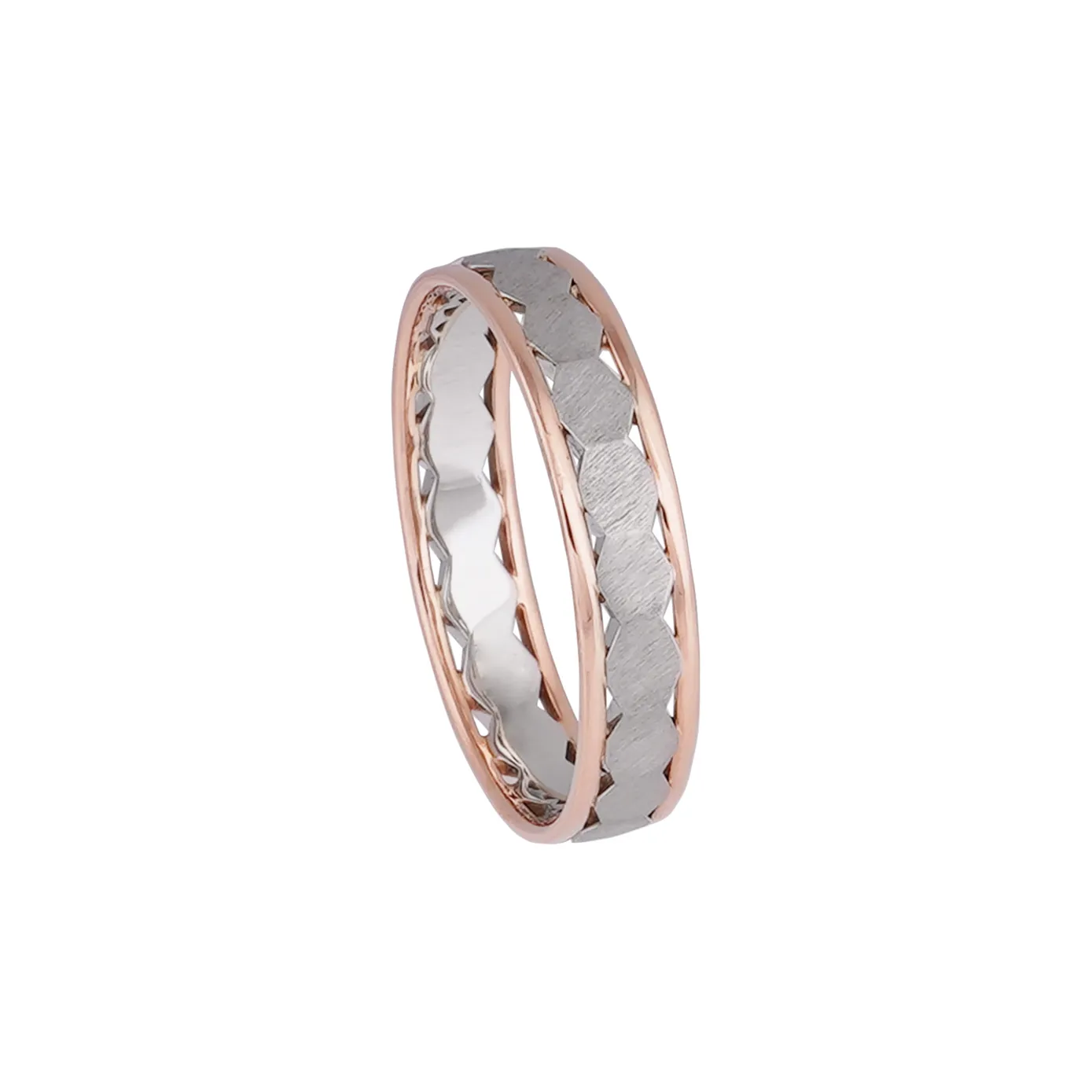 To amaze your look! The product which shows off the different geometrical pattern. The platinum in the central band, covered with rose gold in the borders, finishes the look of perfection and shows the tale of love between the two metals.