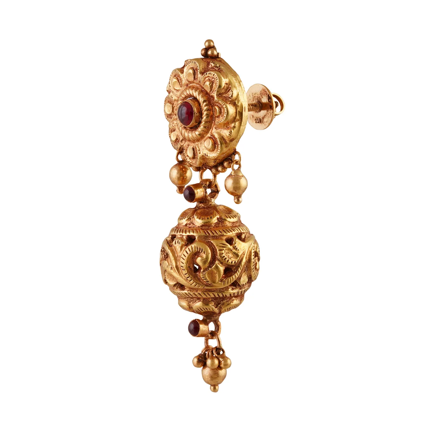 When innovation meets creativity, an exquisite item is created. This specially handcrafted earring is carefully finished with carvings, etching, and embedding spinel stones in a skilled manner. The symbolism of the flower at the top and leaves at the bottom is note-worthy artistry.