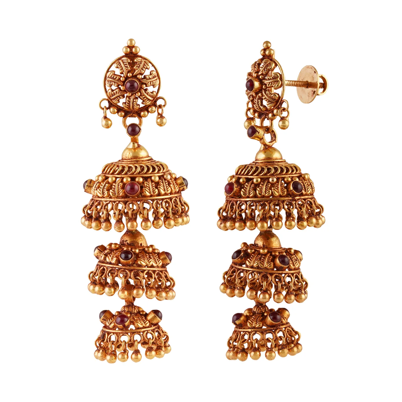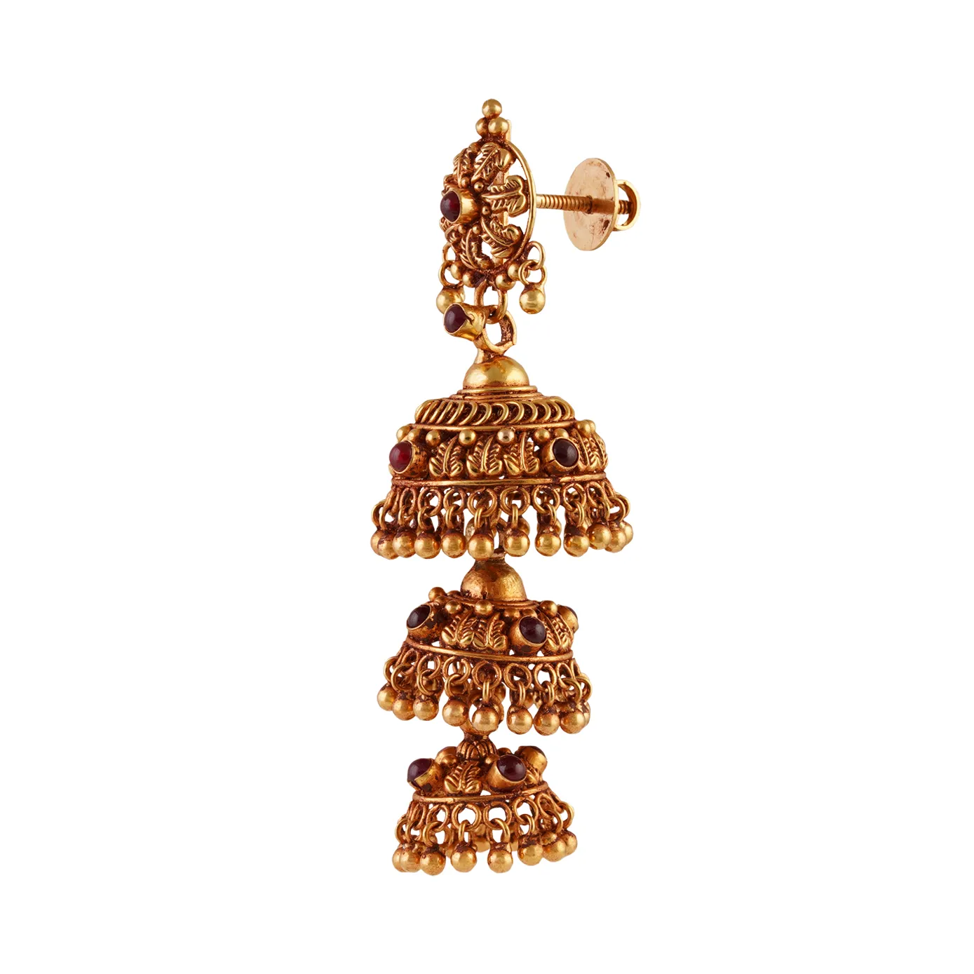 The famous three-layered chandelier jhumka is here to prep your best self for that long-awaited wedding. Though the three domes are fitted together, they independently dance around when you’re on the move, making you look graceful. The spinel stones attribute to the significant points of the jhumka, making it shine bright.