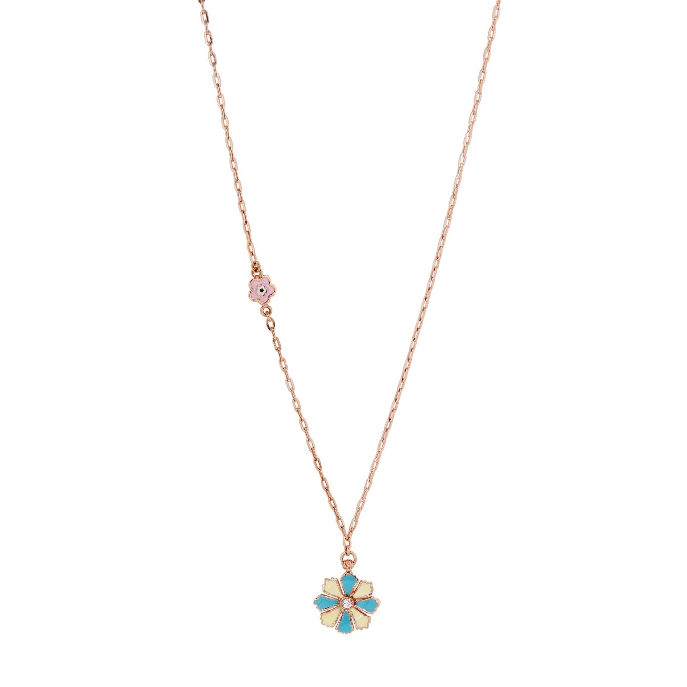 This cute little floral enamel pendant fastened with oval Rolo chain with a flower adjoined with the chain made of 18k rose gold will be a minimalistic attraction.