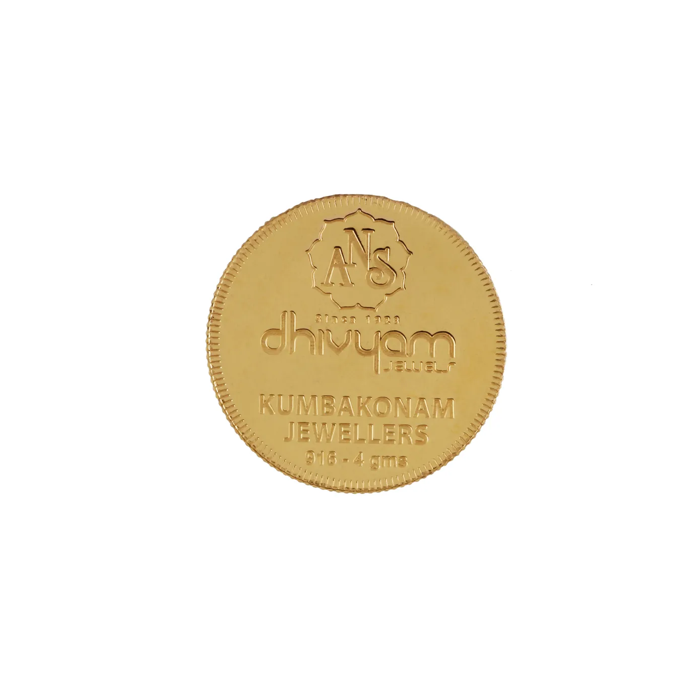 This 4 gram gold coin is designed with 22 karat gold featuring the legacy of 95 years tradition of ANS Dhivyam.