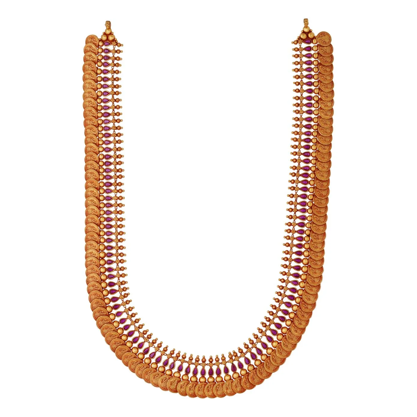It’s not just a typical thanga kasu haram, but an exhilarating jewel that matches the maroon stones with the gold. This haram has a traditional feel and makes any day auspicious.