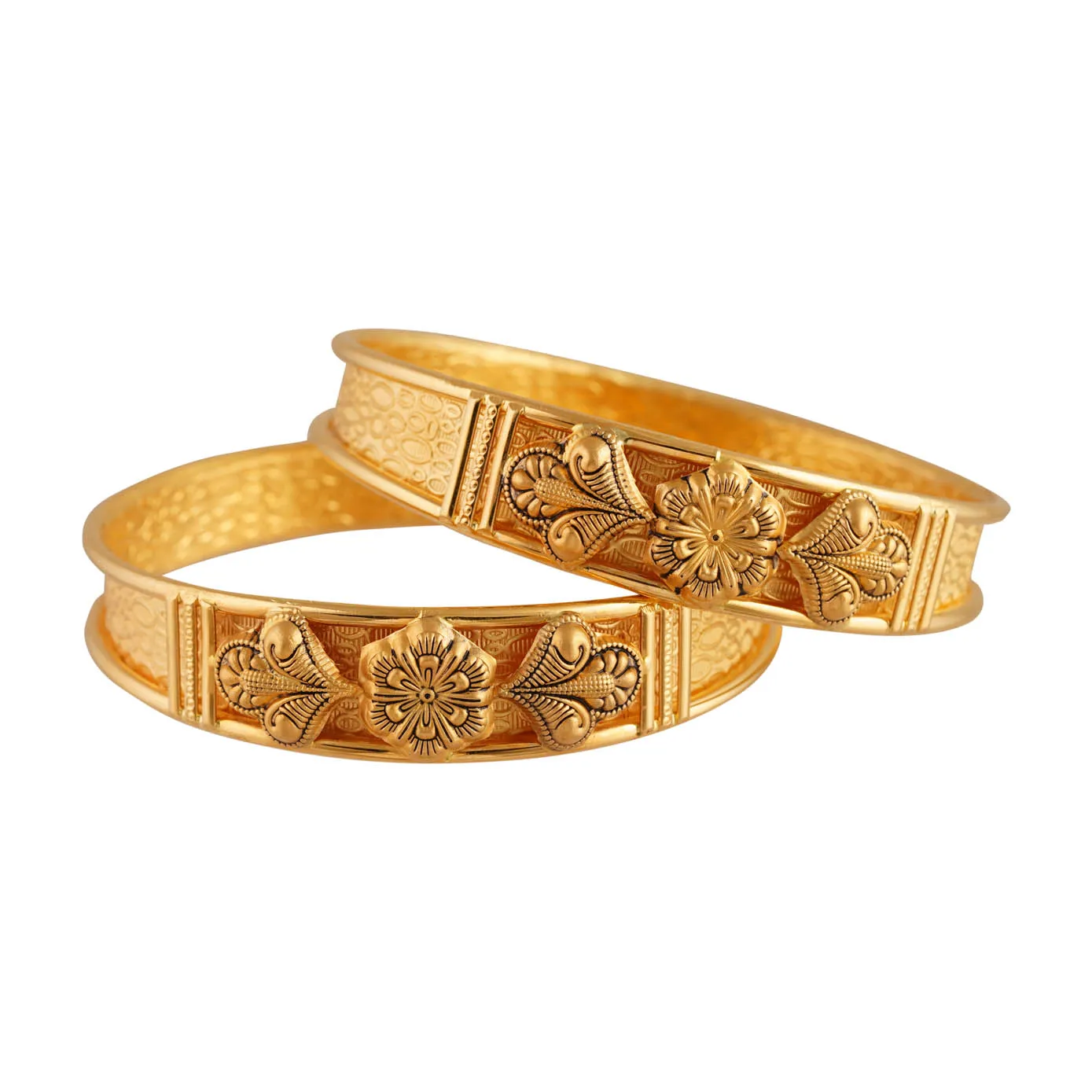 Designed perfectly to fuse with all your ethnic and modern wears, this spell-bounding kada bangle crafted in 22k gold textured in a stunning way to stir up your style quotient. This bangle is Textured all over in water droplet oval pattern and centered with floral motif.