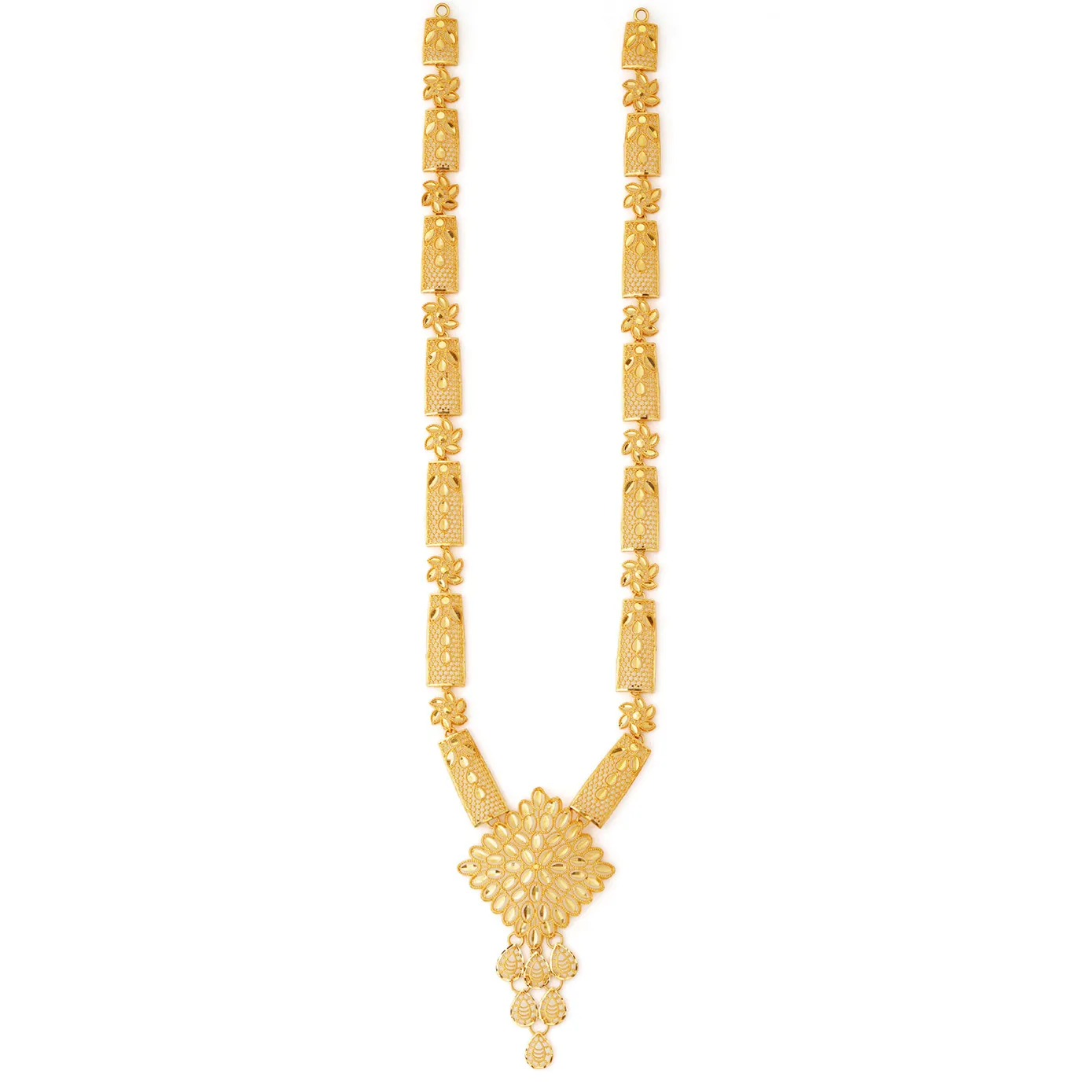 An elegant Mughal designer haram with exquisite, meshed design natural pattern. Yes, carved floral motifs along the length and leaves on the meshed blocks. This complete setup is centered with grand daisy floral motif with water droplets dripping as nectar from that flower. All this complement designed in 22k gold to shoot you into limelight in all the occasions.