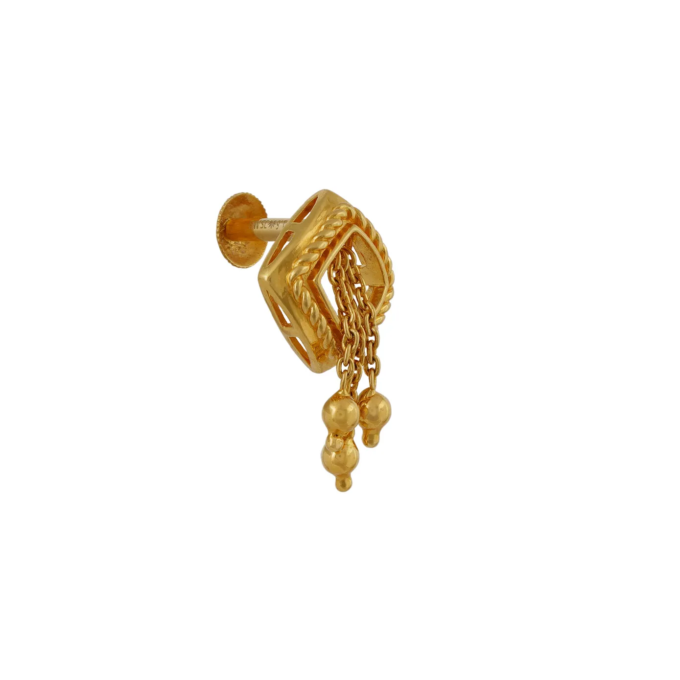 A hong kong setting earring in a different level of design that is added to a square frame with chains hanging on it with gold beads on the ends.