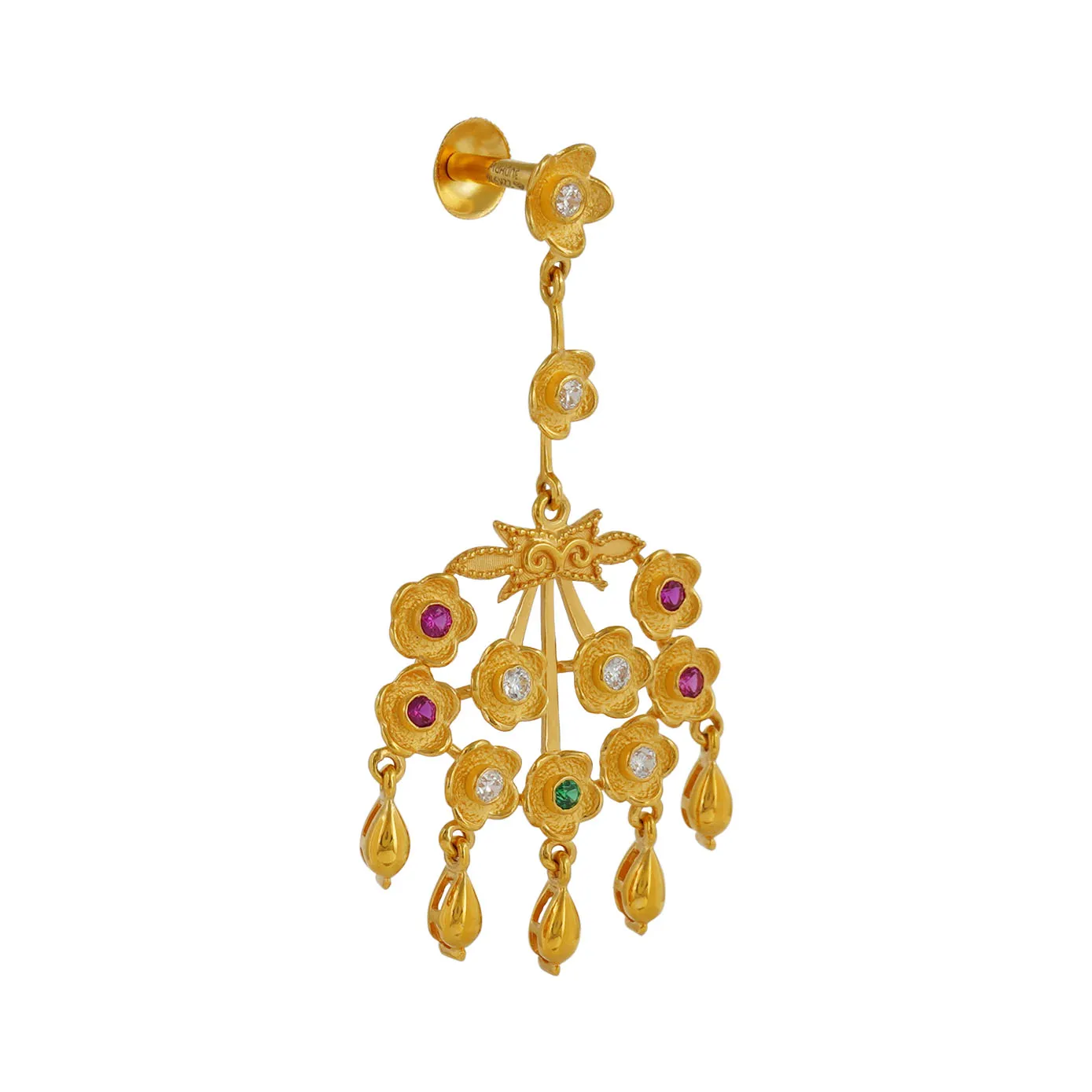 A floral top with five petals studded with hong kong setting hanging earring with tear drops finally added to it.