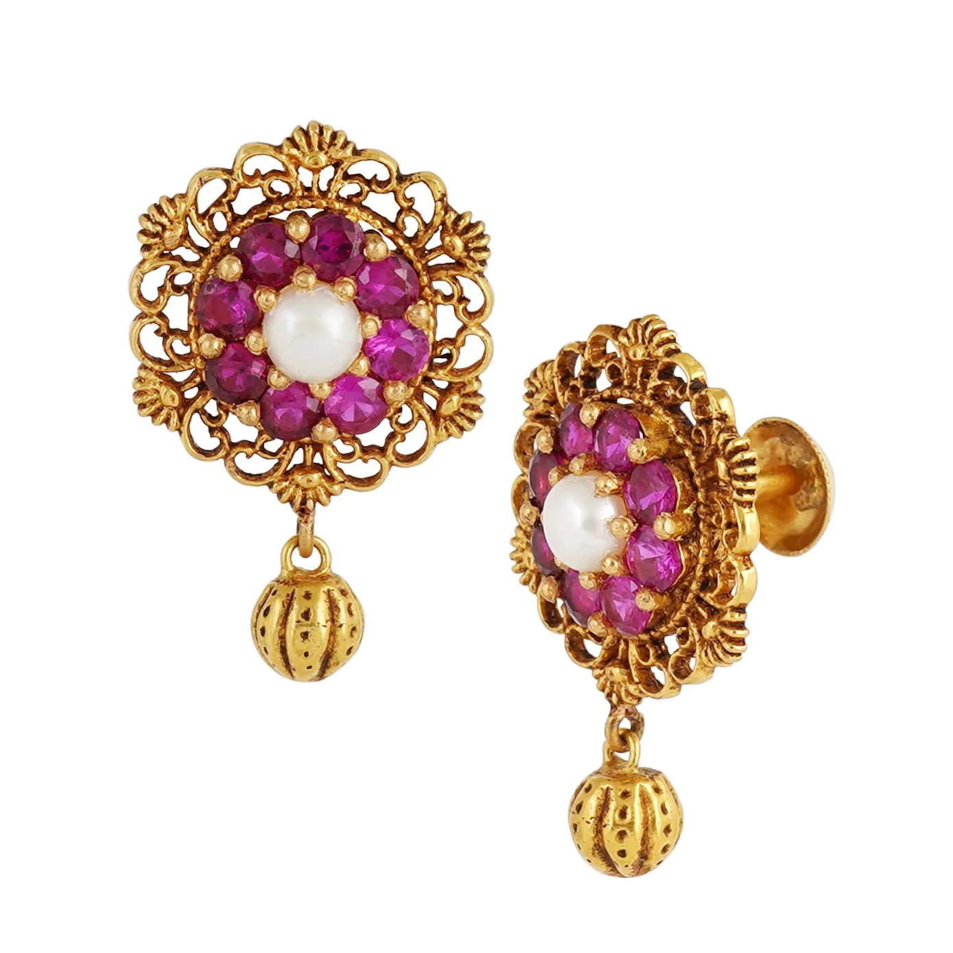 A hexagonal shaped stud with floral filigree centered with pink stones and pearl. The final drop is done with pumpkin bead to finish the earring will really be a companion to your ethnic outfits.