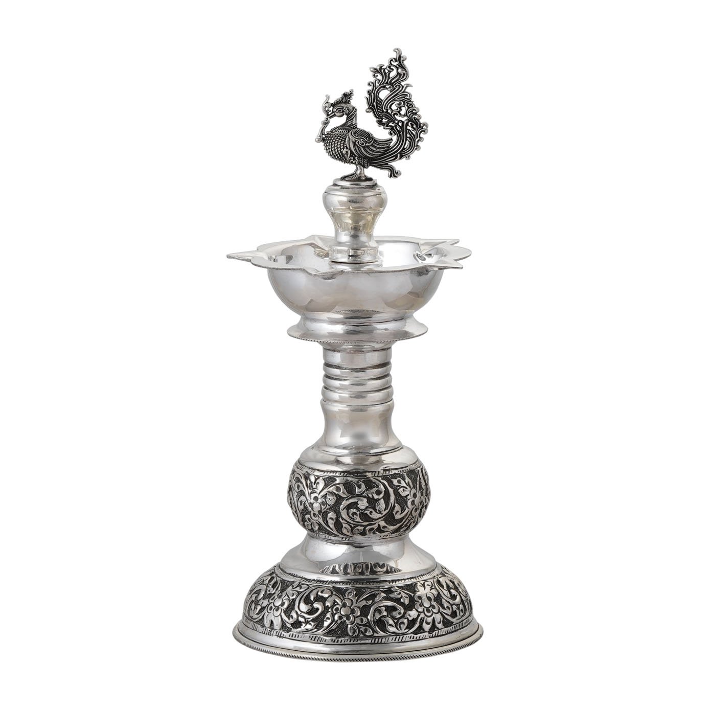 A beautiful Antique five face Kuthu Vizhakku toped with excellently carved and dark polished with unique pattern and the stem of the vizhakku is designed with circular rims and excellent floral vine carvings and made this Silver Kuthu Vizhakku more divine.