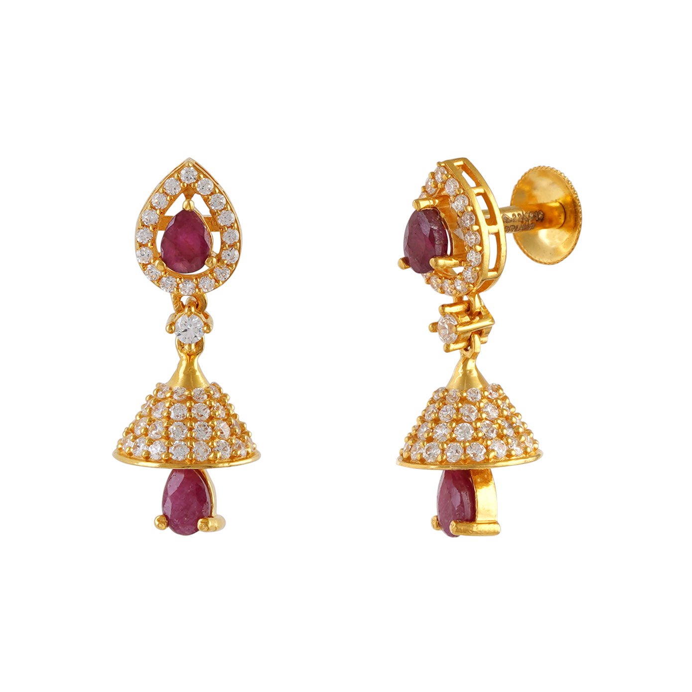 Elegance meets opulence in this stunning jumkka. Shimmering zircons dance along the contours, creating a captivating sparkle that catches the eye. At its heart, a rich array of ruby stones takes center stage, adding a touch of regal allure. This piece is a true embodiment of beauty and luxury, making it a statement accessory for any special occasion.