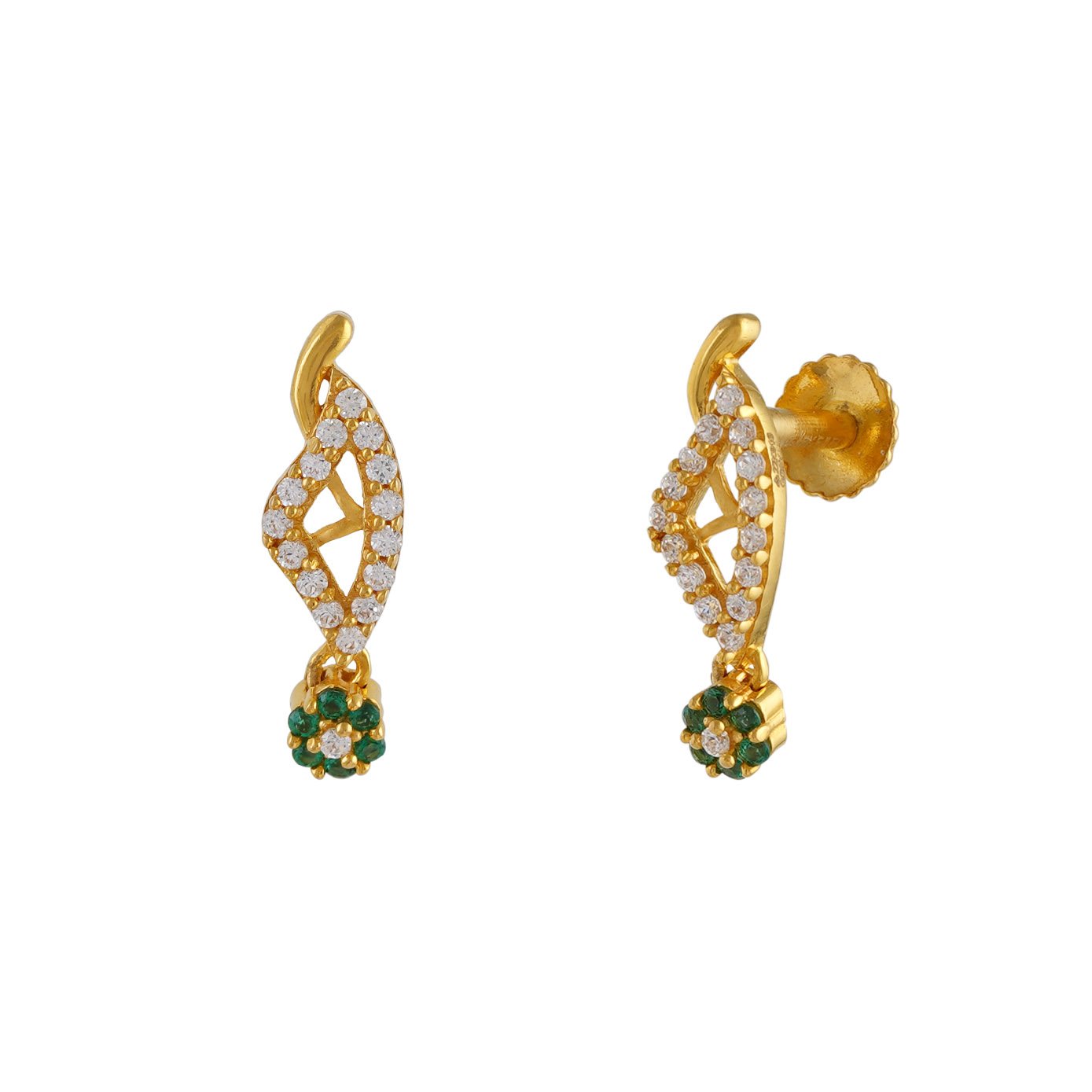 These exquisite tulip-shaped earrings are a striking embodiment of elegance and luxury. Crafted from lustrous 22kt gold, they gleam with a radiant allure. Each petal of the tulip is adorned with sparkling zircons, which catch the light and twinkle with every movement. Nestled within the heart of the tulip, vibrant green stones add a pop of color and a touch of nature's beauty to these gorgeous earrings. These earrings are a harmonious blend of classic design and contemporary style, making them a perfect accessory for any occasion.