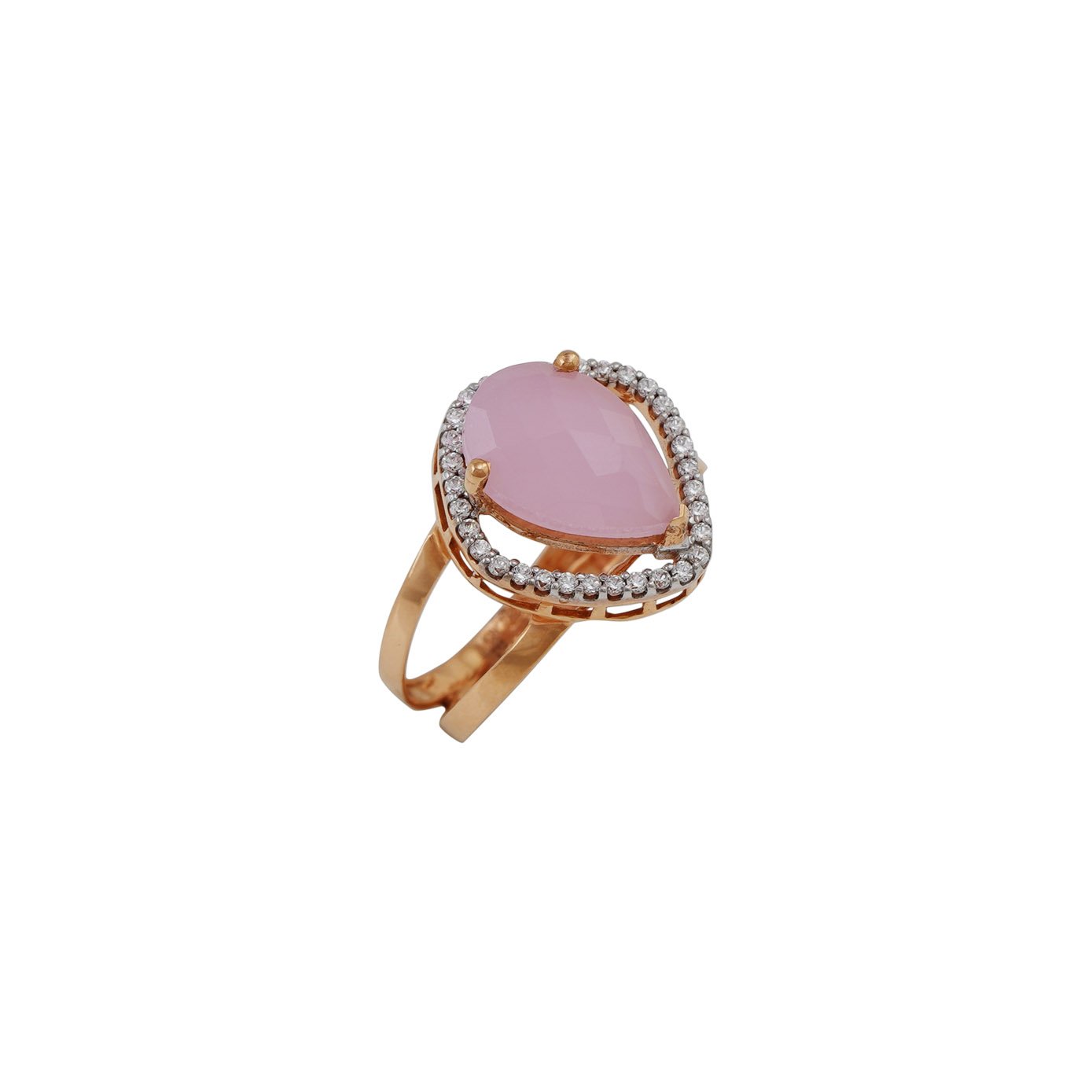 "Petals of Elegance: Grace your fingers with the delicate beauty of this 18kt rose gold ring. A tear-shaped baby pink semi-precious stone takes center stage, embraced by a sparkling halo of zircon stones. Experience the allure of timeless sophistication, as this ring becomes a reflection of your refined style and grace."