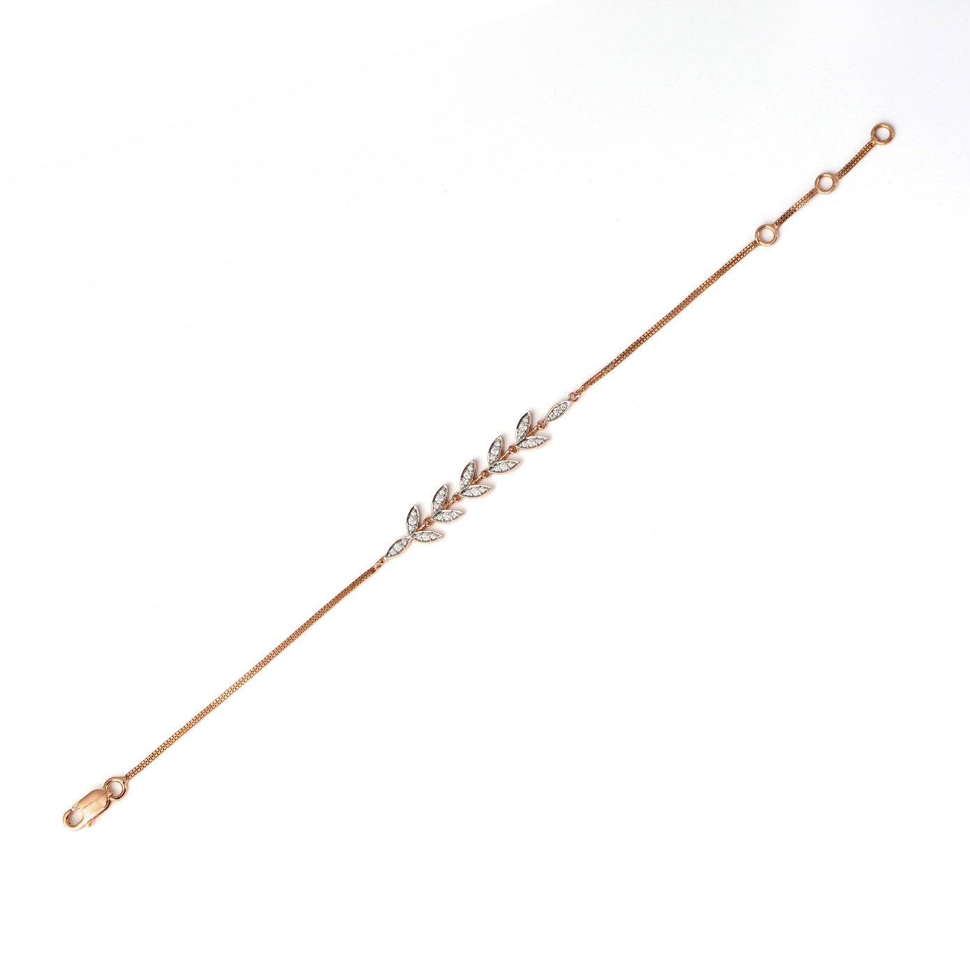 Introducing our exquisite Diamond Leaf Motif Bracelet—a captivating blend of nature-inspired beauty and timeless elegance. Crafted from luxurious 18kt rose gold, this bracelet features a delicate leaf motif that gracefully encircles the wrist, evoking the serenity of a forest in bloom. Each leaf is meticulously adorned with shimmering diamonds, delicately set to enhance their sparkle and brilliance. The intricate detailing of the leaves adds depth and texture to the design, creating a piece that is both elegant and enchanting. With its versatile design and subtle sophistication, this bracelet is the perfect accessory for any occasion. Whether worn alone for a touch of understated glamour or layered with other favorites for a more personalized look, our Diamond Leaf Motif Bracelet is sure to make a statement with its exquisite craftsmanship and timeless beauty.