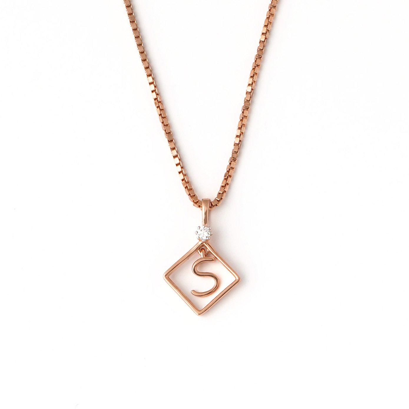 Introducing our elegant 18kt Rose Gold Chain with S-Initial Pendant—a timeless symbol of personal style and sophistication. Crafted with meticulous attention to detail, this necklace features a sleek and delicate rose gold chain that adds a touch of warmth and elegance to any ensemble. At the center of the necklace hangs a beautifully crafted S-Initial pendant, encased within a square shutter design. The initial is intricately adorned with a single sparkling diamond, set in a six-prong setting that adds a touch of brilliance and charm to the piece. Perfect for both everyday wear and special occasions, this necklace is the perfect accessory to elevate your style with its understated elegance and personalized touch. Whether worn alone as a chic statement piece or layered with other favorites for a more personalized look, our Rose Gold Chain with S-Initial Pendant is sure to capture hearts and turn heads with its exquisite craftsmanship and timeless allure.