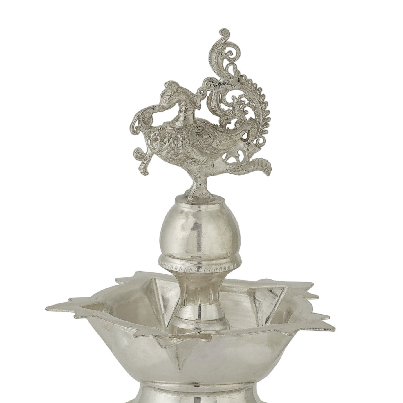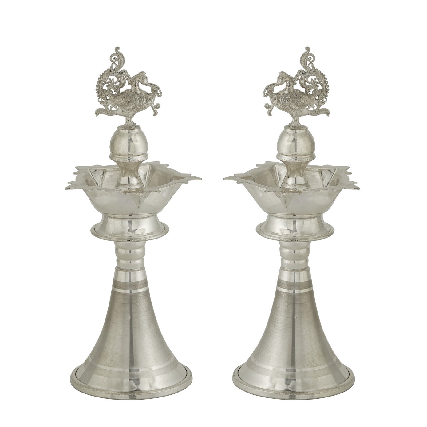 This matt finish Kuthu Vilakku is a stunning embodiment of traditional craftsmanship and elegance. At its base, a cone shape adds a touch of classic charm, while the five-faced lamp above radiates warmth and light. Topping this masterpiece is a beautifully carved Hamsa, an Annapakshi, symbolizing purity and grace. Crafted with intricate detailing, this lamp captures the essence of heritage and spirituality. Its matte finish lends a timeless appeal, while the symbolic motifs evoke a sense of reverence and sanctity. Perfect for enriching any sacred space or as a decorative centerpiece, this Kuthu Vilakku embodies the beauty and tradition of our culture.