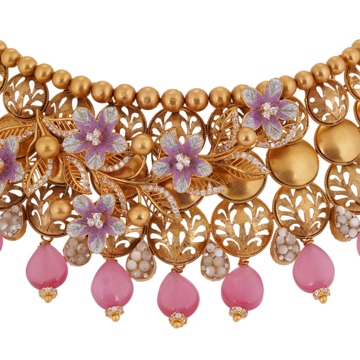 Craft your unique fashion proclamation through the enchanting contemporary allure of this gold choker, elegantly adorned with a subdued matte finish. The harmonious interplay of dainty pearls and delicate pink beads harmonizes in such exquisite synchrony that they seamlessly consummate the jewel's entirety. The intricate enamel artwork delicately gracing the flowers stands as a testament to its inherent beauty. Acquire this splendid gold choker to adorn yourself in resplendent grace, transforming into a captivating embodiment of elegance.
