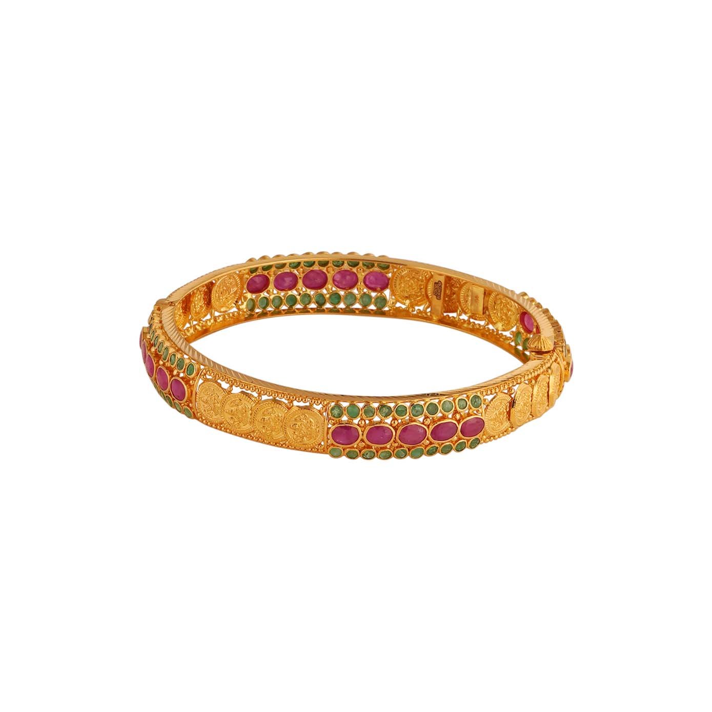 Adorn your wrist with this exquisite 22kt gold bangle, showcasing a captivating Lakshmi coin motif at its center. The bangle features beautifully crafted rims, seamlessly connecting the traditional design with modern elegance. Oval-shaped rubies add a rich pop of color at the corners, while round emeralds enhance the overall aesthetic with their vibrant hues. This stunning piece combines divine symbolism and luxurious gemstones, making it a perfect accessory for celebrations or any occasion where you wish to make a statement.