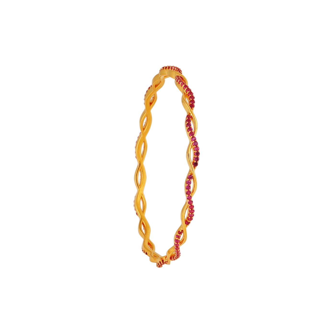 Crafted in 22kt yellow gold, this elegant bangle features two delicate strips intricately braided together. One strip showcases the timeless beauty of plain gold, while the other is studded with radiant red stones, creating a stunning contrast. A perfect blend of simplicity and sophistication, this bangle adds a touch of elegance to any occasion.