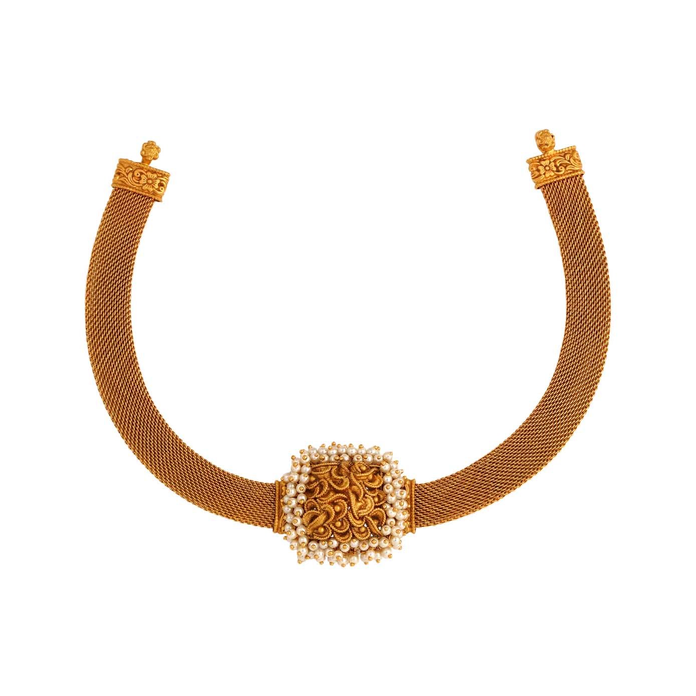 Make a statement with this exquisite 22kt gold necklace, showcasing an intricate filigree pattern that exudes timeless elegance. Pearl loreals gracefully highlight the design, adding a touch of sophistication and charm. The centerpiece is a beautifully crafted pendant featuring a rounded maze design, adorned with delicate mini gold beads for a hint of movement and texture. Perfect for special occasions, this necklace combines traditional craftsmanship with modern artistry to create a captivating masterpiece.