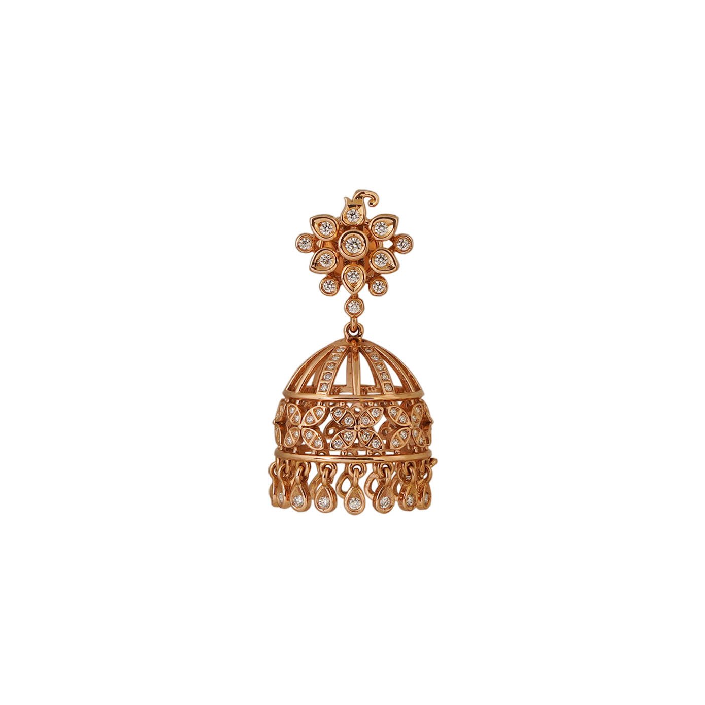 This exquisite 18kt rose gold jhumka is a breathtaking blend of traditional charm and modern elegance. The stud features a delicate floral motif adorned with shimmering diamonds, setting the tone for the piece’s refined beauty. Suspended from the stud is a gracefully designed dome-shaped jhumka, radiating sophistication with its intricate detailing and diamond embellishments. The circular rim of the jhumka is highlighted with four-petaled flowers, each sparkling with meticulously set diamonds. Adding to its allure, mini petal hangings studded with diamonds delicately sway below, creating a captivating movement. This jhumka is a perfect statement piece, offering timeless elegance for any special occasion.
