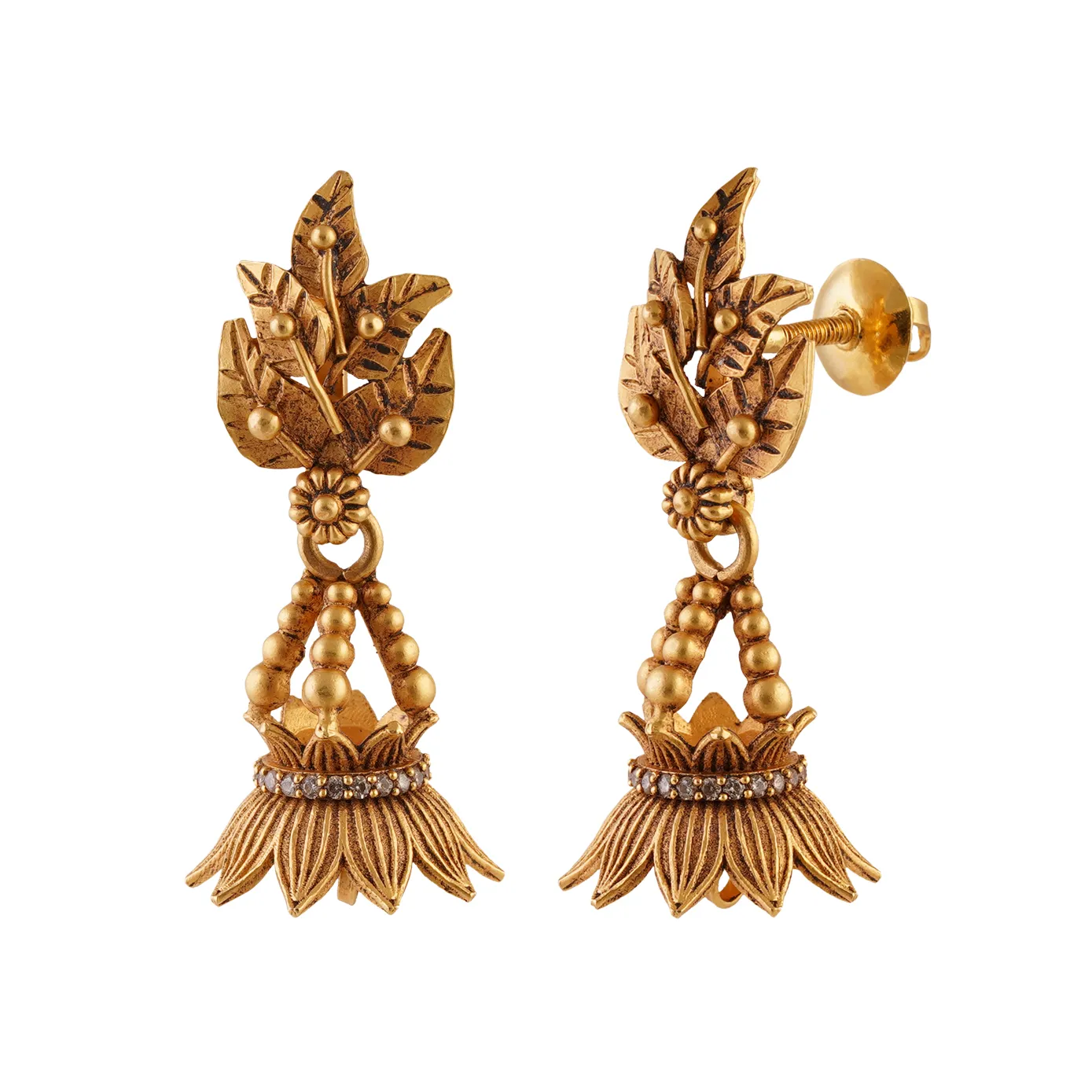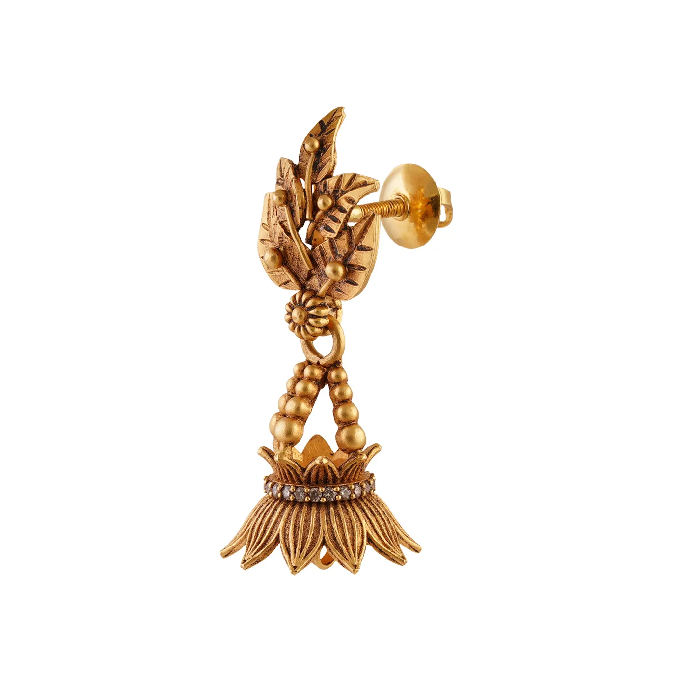 With a design like Kalasam at the bottom and the outgrown leaves at the top, this is surely a one-of-a-kind Jhumka to lend an ear. Pairing this jewel with your designer clothes not only multiplies your elegance but also your sense of fashion. Add your individual signature to this sophisticated Jhumka.