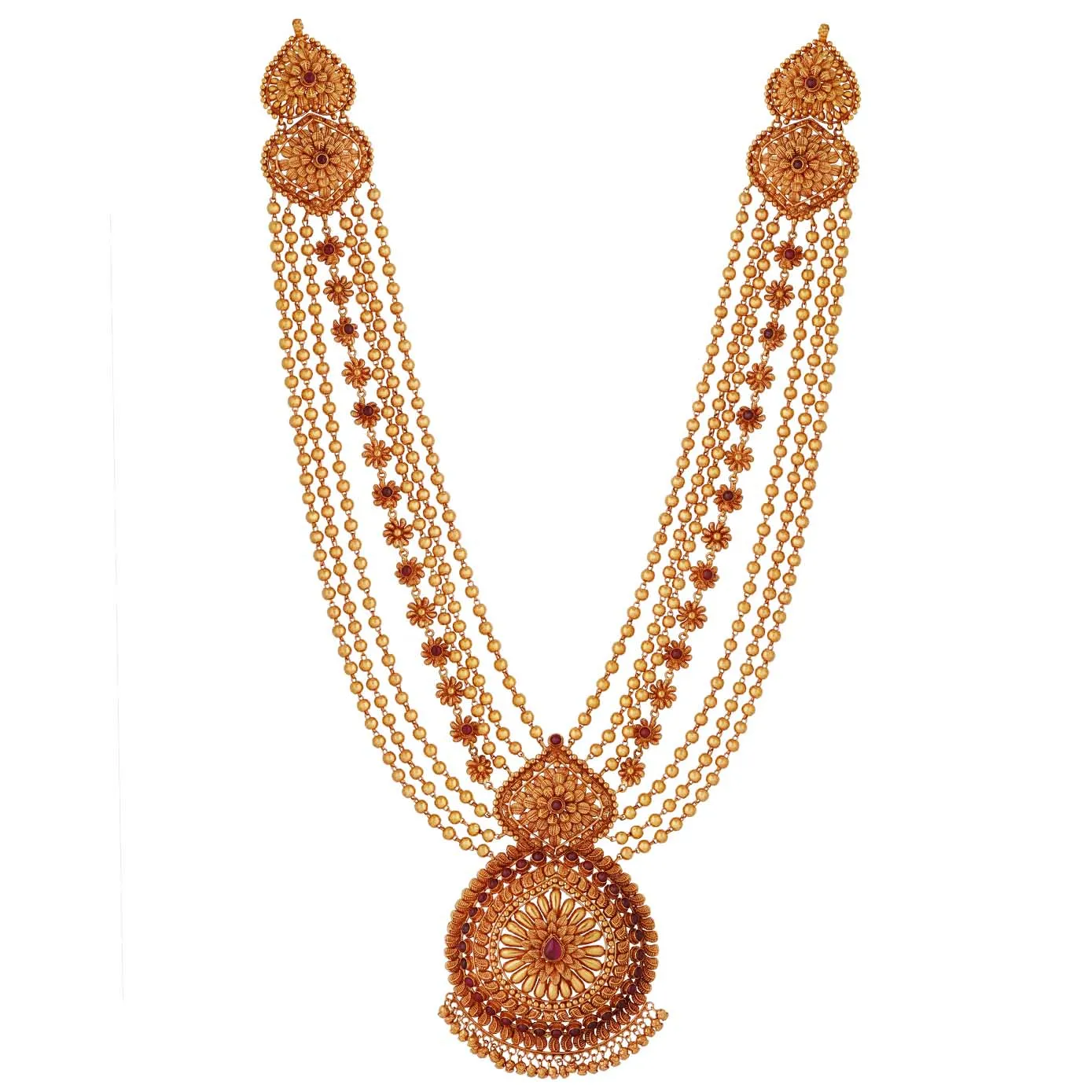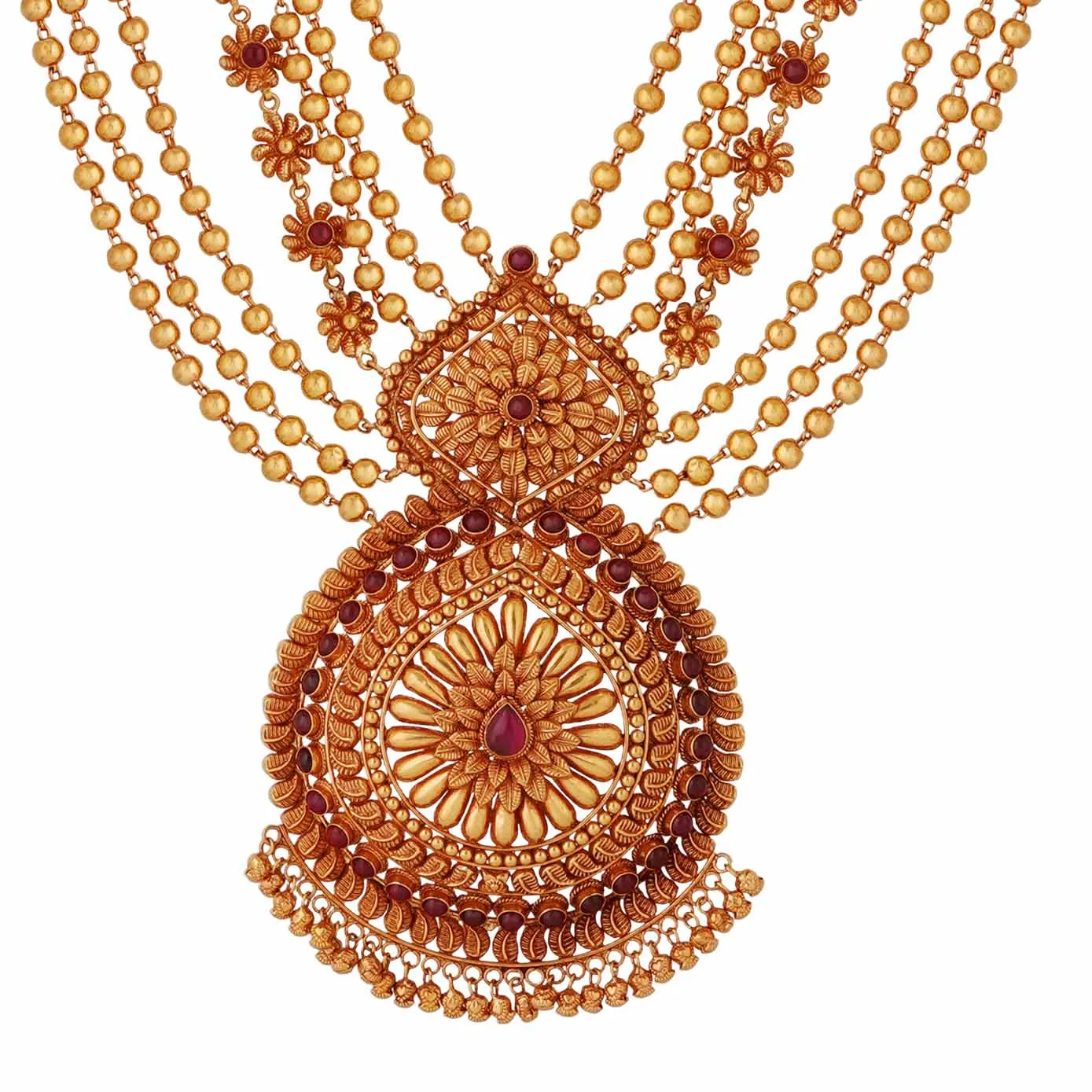 This spellbinding haram is considered to be the manifestation of Lakshmi’s grace and elegance. The multiple layers of gold balls and a single layer of flowers all connect to the core flower at the center, symbolizing the foundation that should never be forgotten.