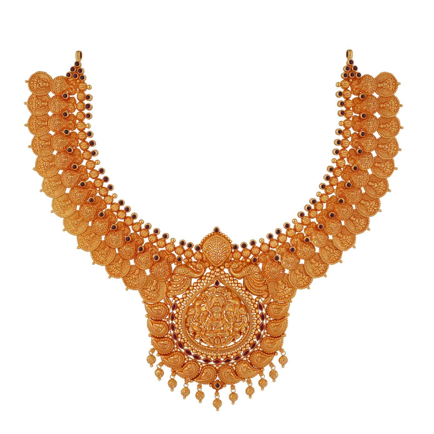 This gold necklace serves as a radiant embodiment of our rich heritage, casting a luminous spotlight on its timeless splendor. Adorned with a captivating layer of intricately patterned gold kasu, it finds its counterpart in an equally exquisite layer of design, creating an enchanting symphony that elegantly cradles the central focal point: the entrancing Lakshmi pendant.