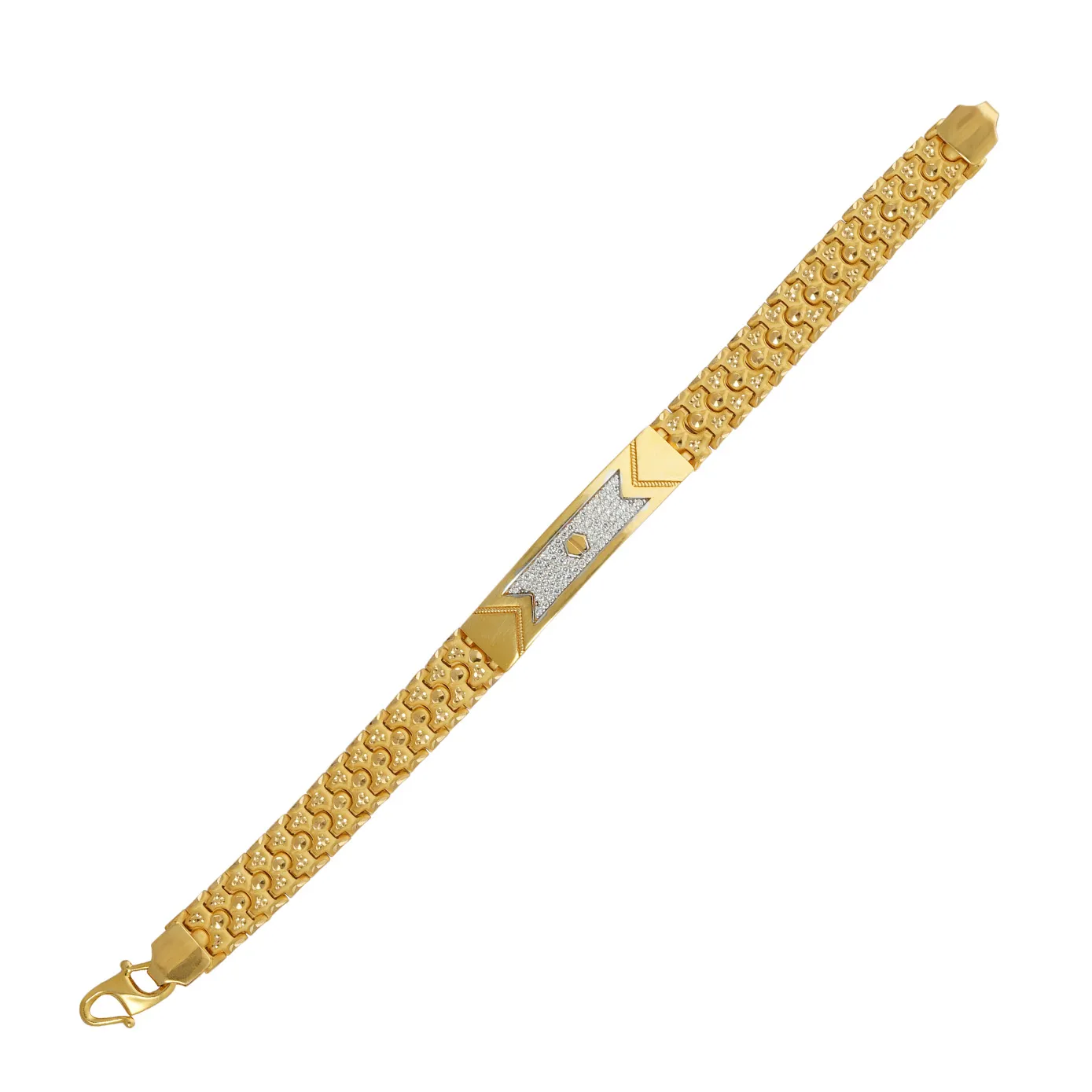 The refreshing gold treasure to remark your everyday look with excellent traditional elegance. The bold zircon beaded center with hexagonal matrix fastened with maze wrist band uniquely carved in each and every gold block, will sure be the family treasure.
