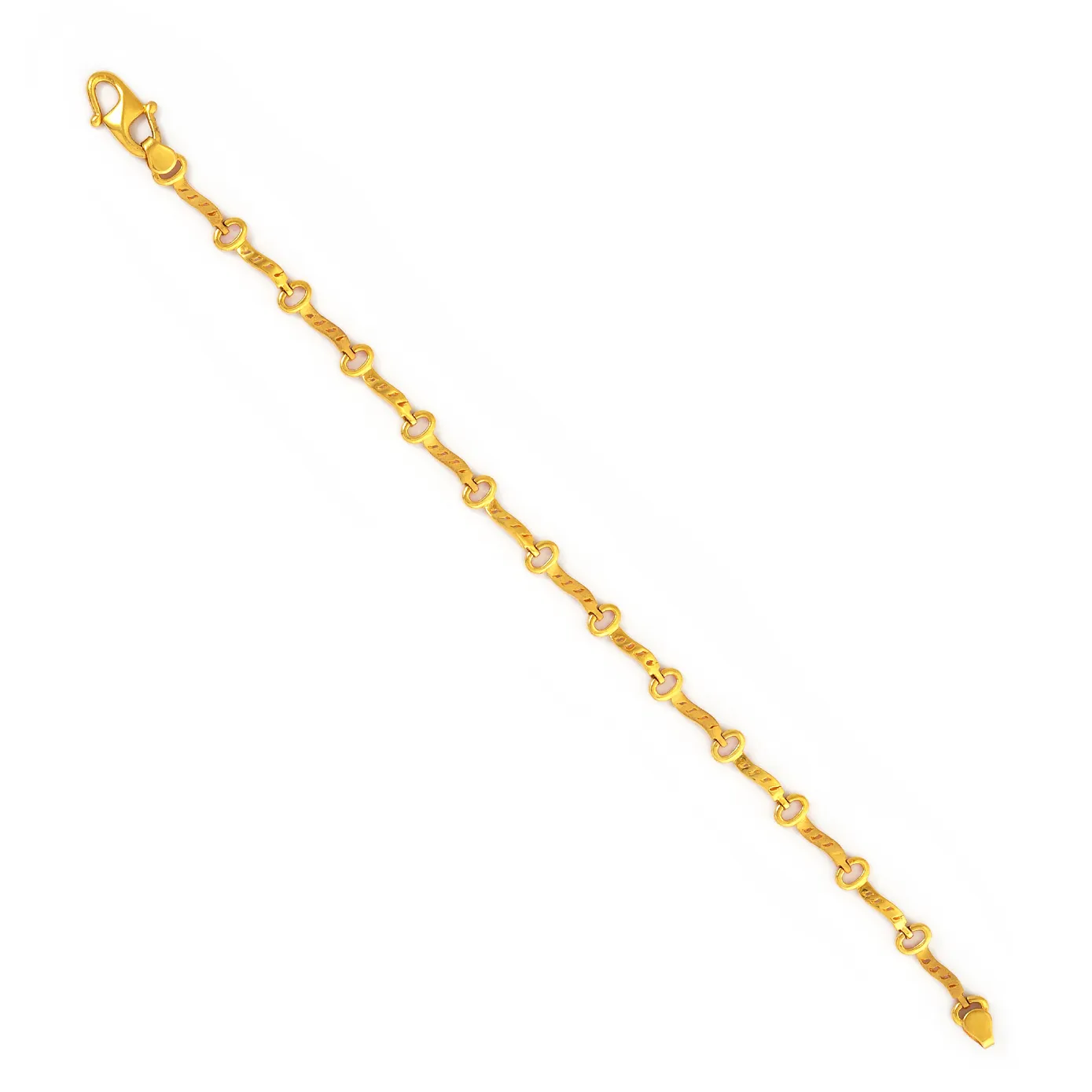 A dazzling 22k gold strips carved and cut into equal parts and joined together with loops interlinked with each other to make a minimal bracelet. Illuminate every occasion with this stunner.