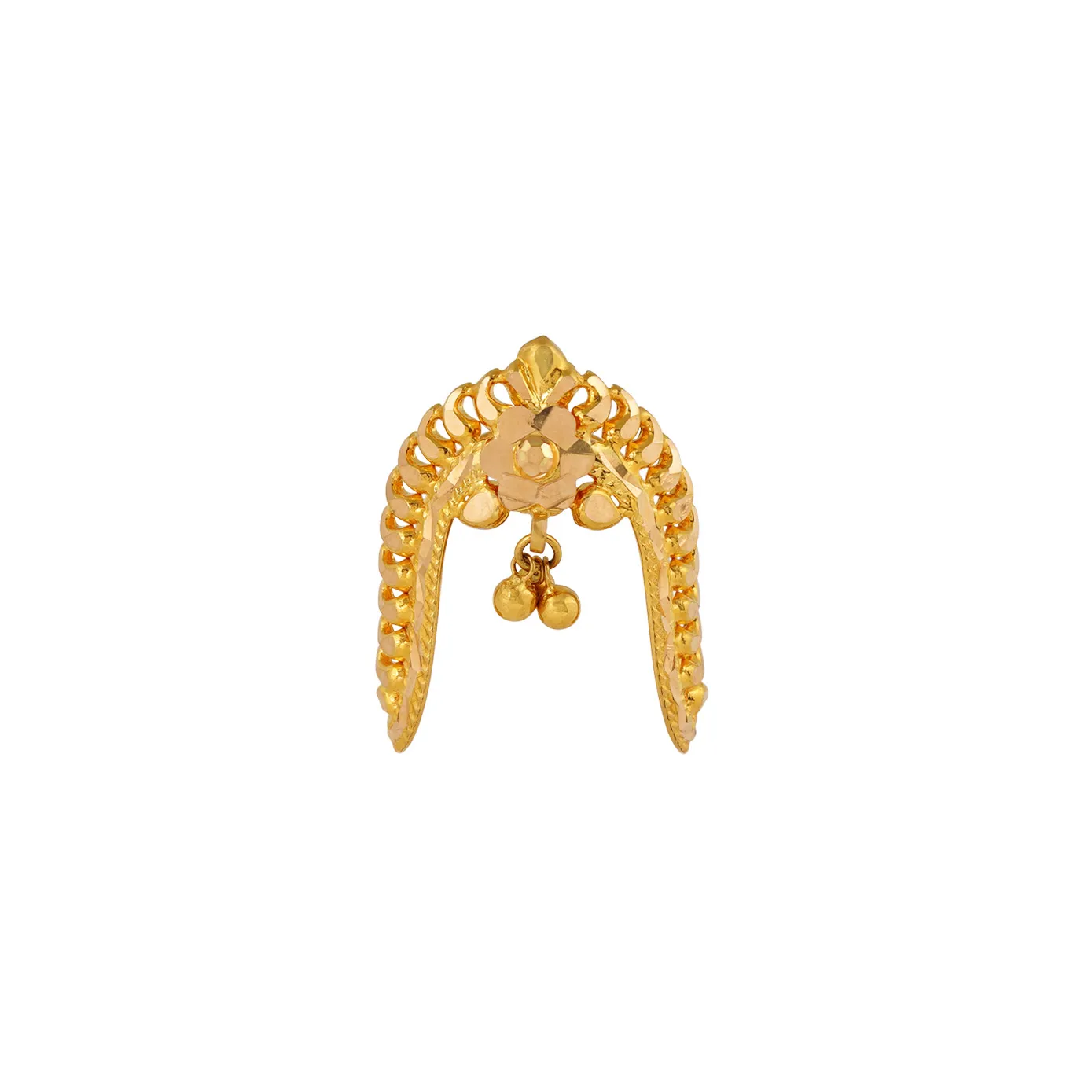 An enticing finger ring like an ethereal vanki ring, a floral carving in the center and toped with paisley border and little golden dropping designed in 22k gold, will be a great treasure to pass on to generations.