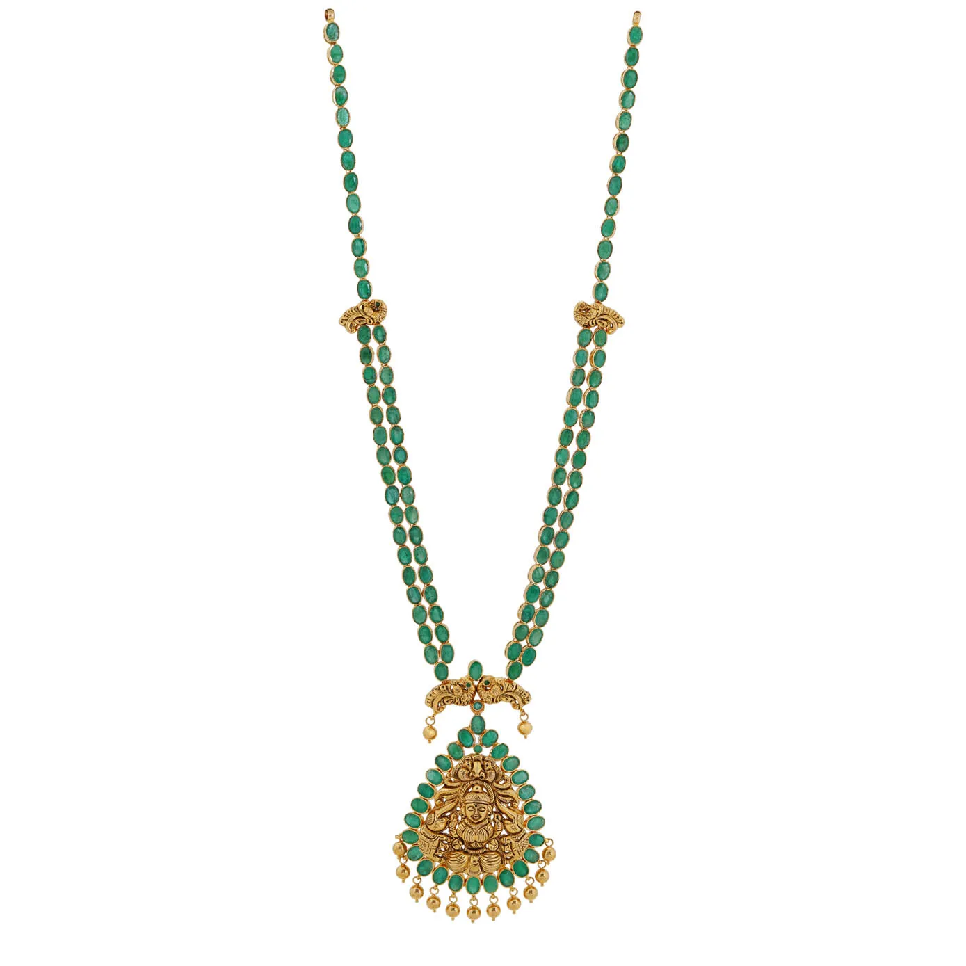 Mangala Dhivyam is an exclusive collection by ANS Dhivyam, this emerald studded 22k gold haram will match your silk sarees in mild tone and pastel colors. This emerald haram is crafted with matching lakshmi pendant as she seats on kamal mandap, sided by gaja morthis and added with gold bead hangings fastened with the dual strip of emerald layers ended with peacock motif. Let's you to look heavenly on all your special occasions and makes you to flaunt your beauty.