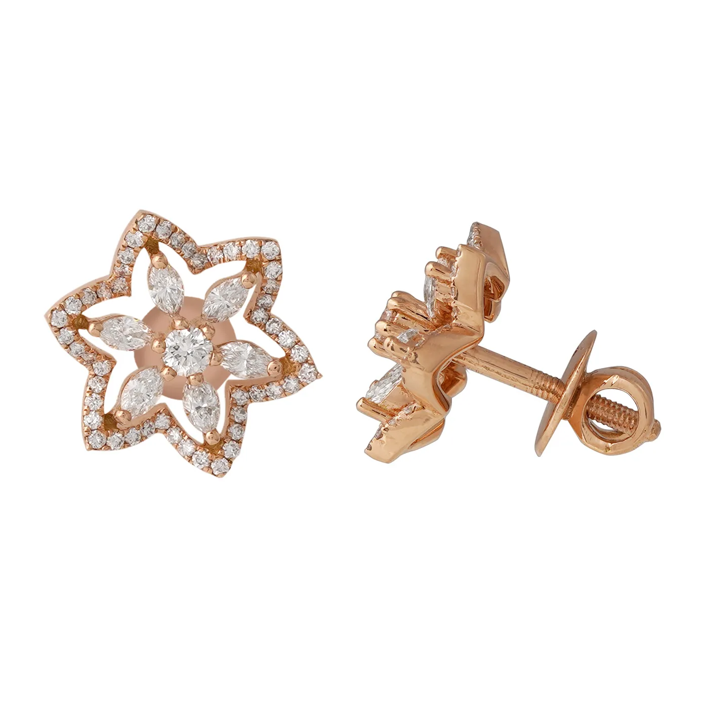 Elevate your style with our 18k rose gold floral bloom, a harmonious fusion of modesty and boldness. This exquisite piece, with an open setting, is adorned with petite round-cut diamonds and delicate diamond marquise petals. Crafted to enhance your aesthetic appeal, it's a captivating addition that effortlessly balances subtlety with allure, making it the perfect choice to accentuate your unique style.